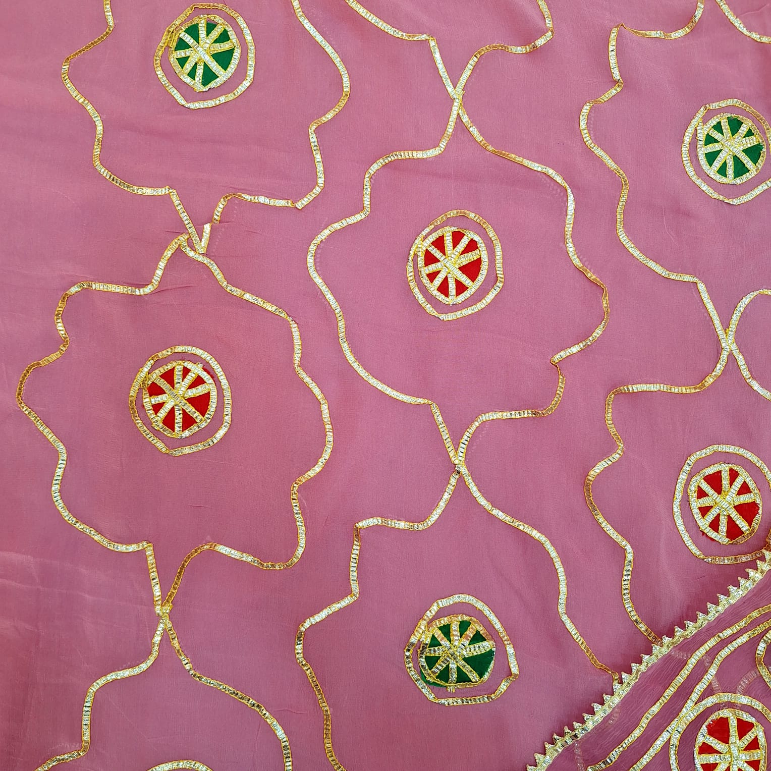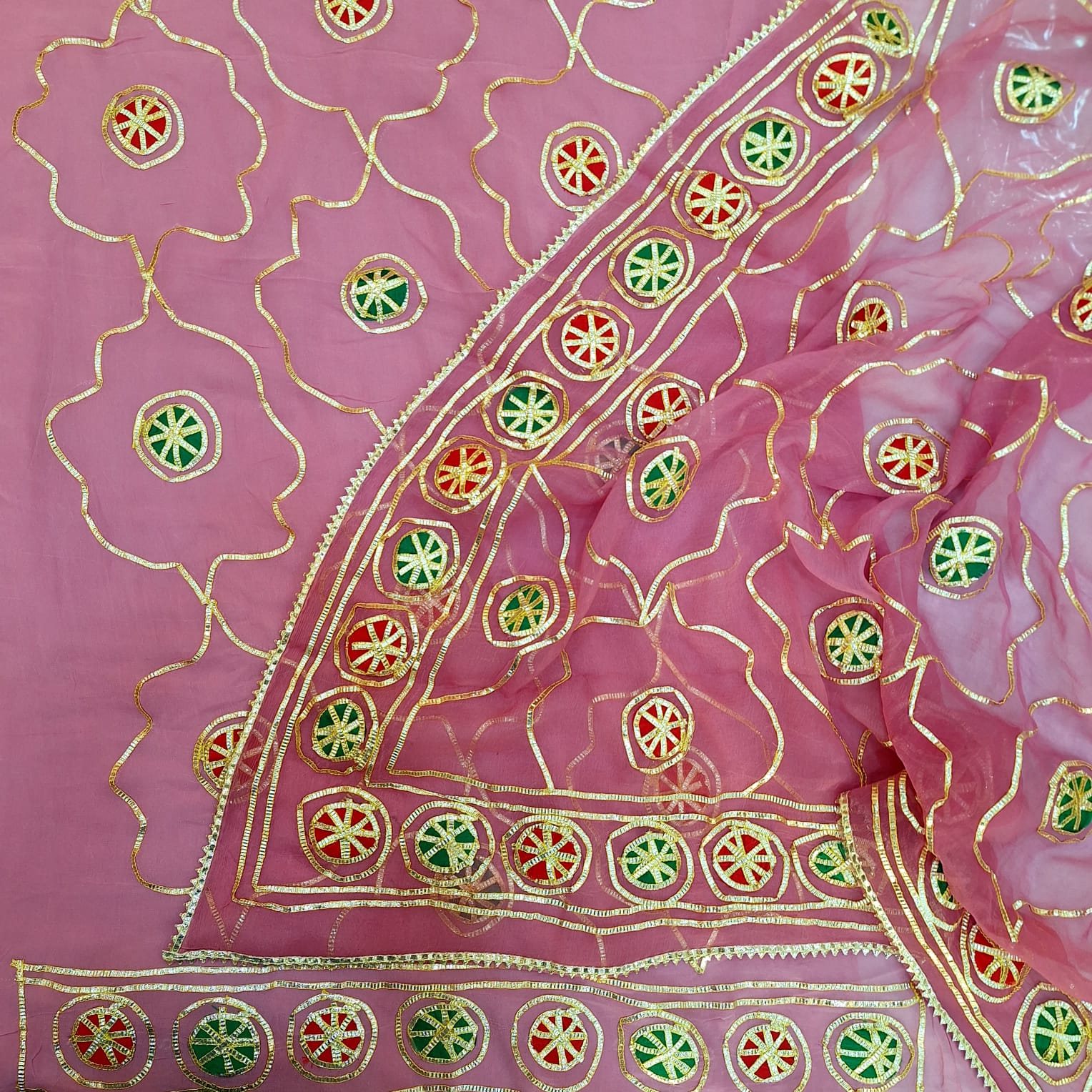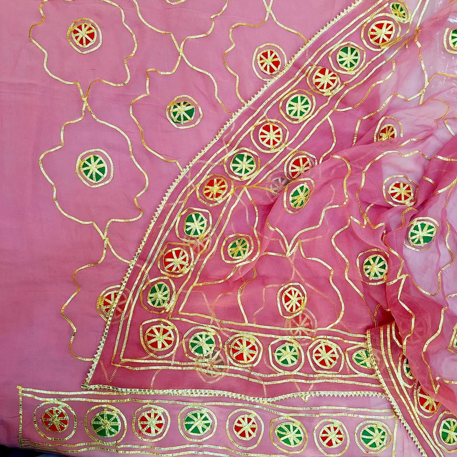 Crafted in rich Dola silk, this elegant suit set showcases exquisite Kacha Gota handwork that adds a touch of traditional artistry and festive charm. The vibrant orange kurta features finely detailed handcrafted embellishments, creating a perfect balance of sophistication and statement appeal. The set is paired with a comfortable santoon pant that offers a smooth fit and effortless wear. Completing the ensemble is a lightweight chiffon dupatta, enhancing the look with soft movement and graceful drape. Ideal for festive celebrations, weddings, and special occasions, this ensemble reflects timeless craftsmanship and refined elegance.