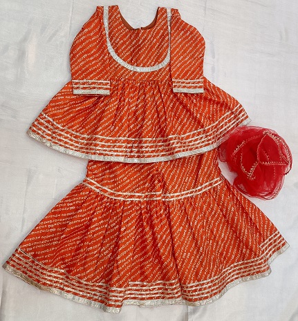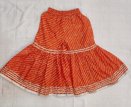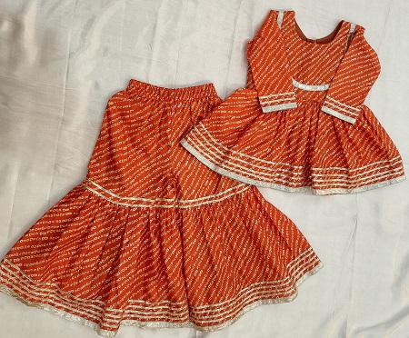 Give your little girl a charming festive look with this stunning orange Bandhej print silk peplum and sharara set. Designed in luxurious silk fabric, the peplum top features traditional Bandhej patterns, paired with a flared sharara for a graceful ethnic silhouette. The matching dupatta is beautifully finished with lappa and gota lace detailing, adding a rich festive touch. Perfect for weddings, festivals, and celebrations, this kids set blends traditional elegance with adorable comfort for a picture-perfect look.