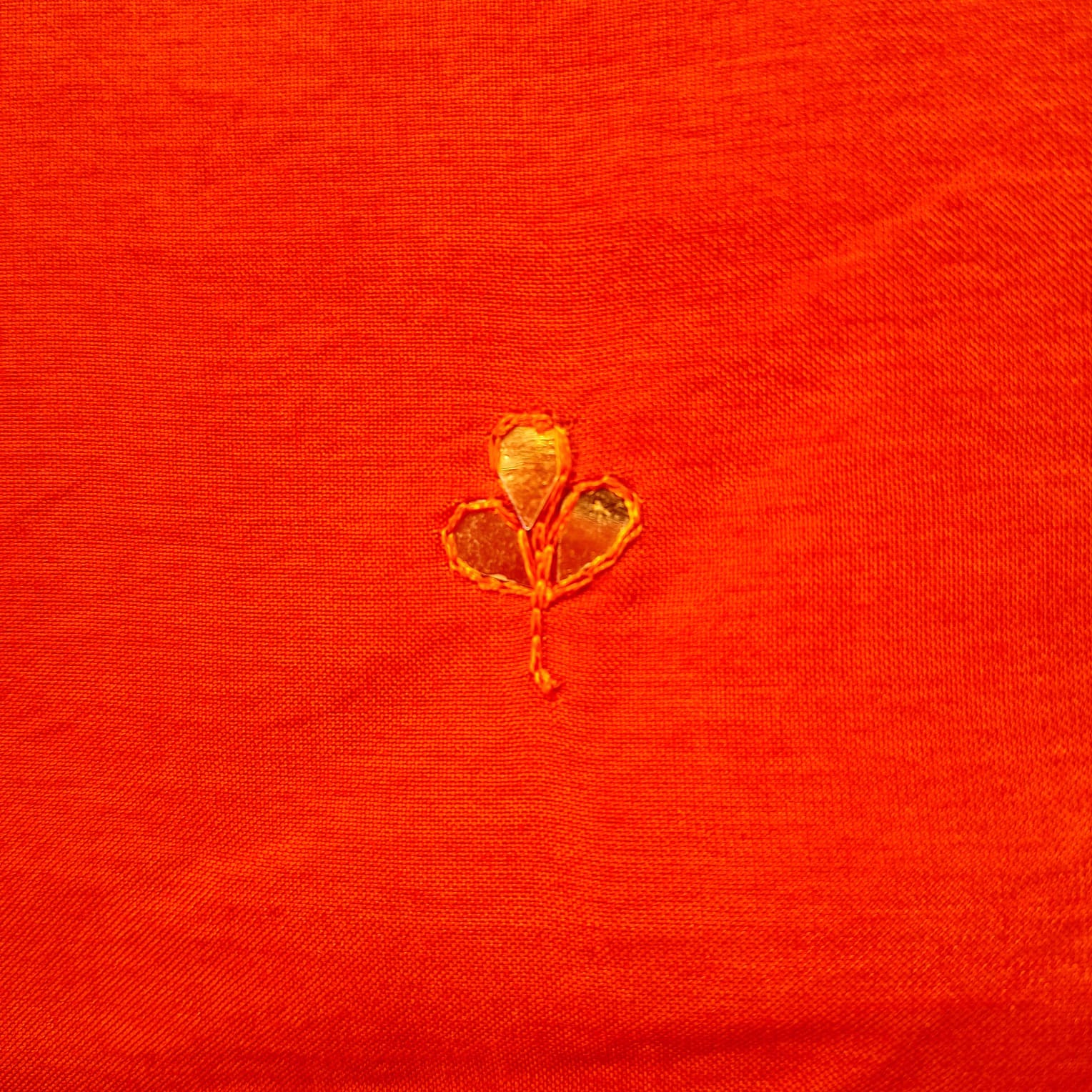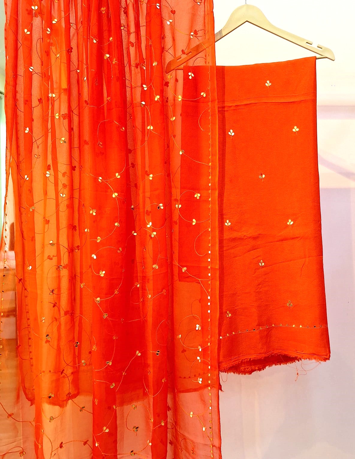 Crafted in rich Dola silk, this elegant suit set showcases exquisite mirror and thread handwork that adds a touch of traditional artistry and festive charm. The vibrant orange kurta features finely detailed handcrafted embellishments, creating a perfect balance of sophistication and statement appeal. The set is paired with a comfortable santoon pant that offers a smooth fit and effortless wear. Completing the ensemble is a lightweight chiffon dupatta, enhancing the look with soft movement and graceful drape. Ideal for festive celebrations, weddings, and special occasions, this ensemble reflects timeless craftsmanship and refined elegance.