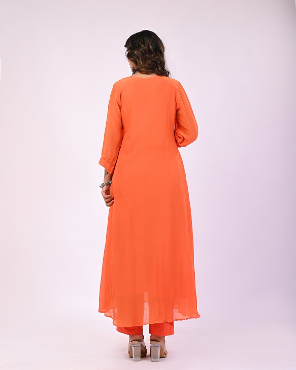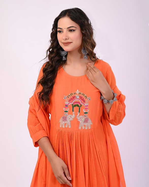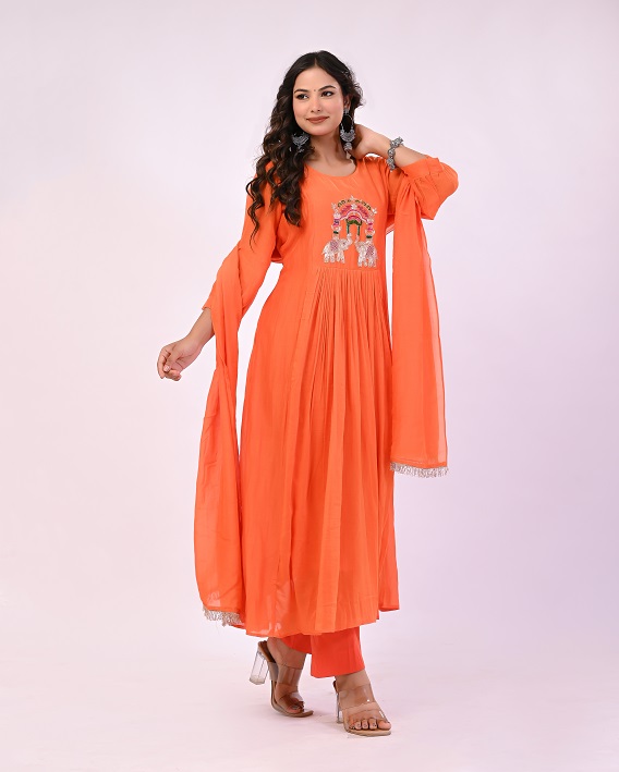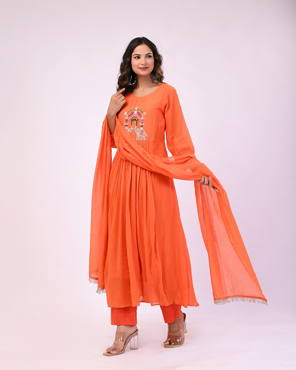 Radiating warmth and grace, this Orange Mulchanderi Handwork Suit Set captures the essence of summer elegance. The soft, breathable mulchanderi fabric flows effortlessly, making it ideal for long wear during daytime events. Adorned with delicate handwork—featuring hints of pitton and fine thread detailing—this ensemble brings together tradition and subtle sophistication. Perfect for festive occasions or graceful day functions, it adds a cheerful vibrance to your summer wardrobe while keeping comfort at its core.