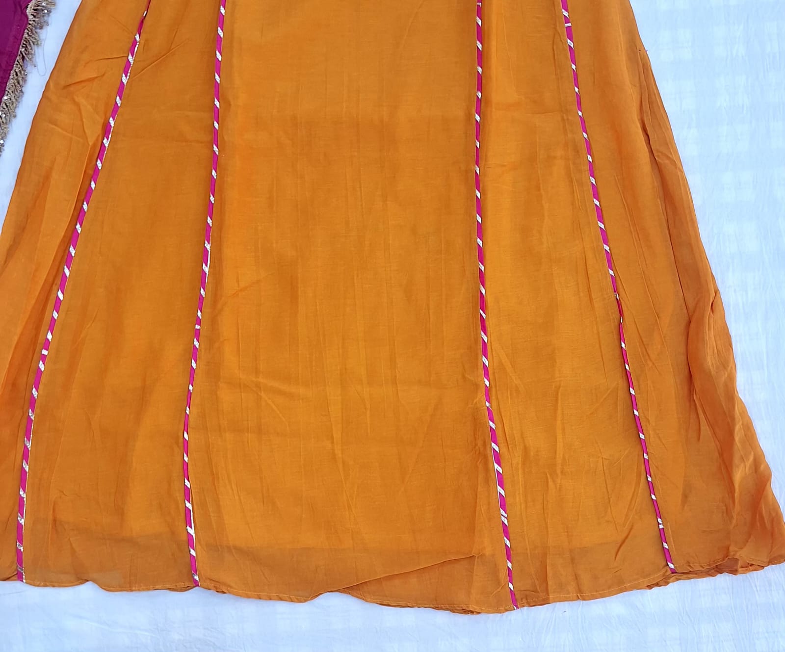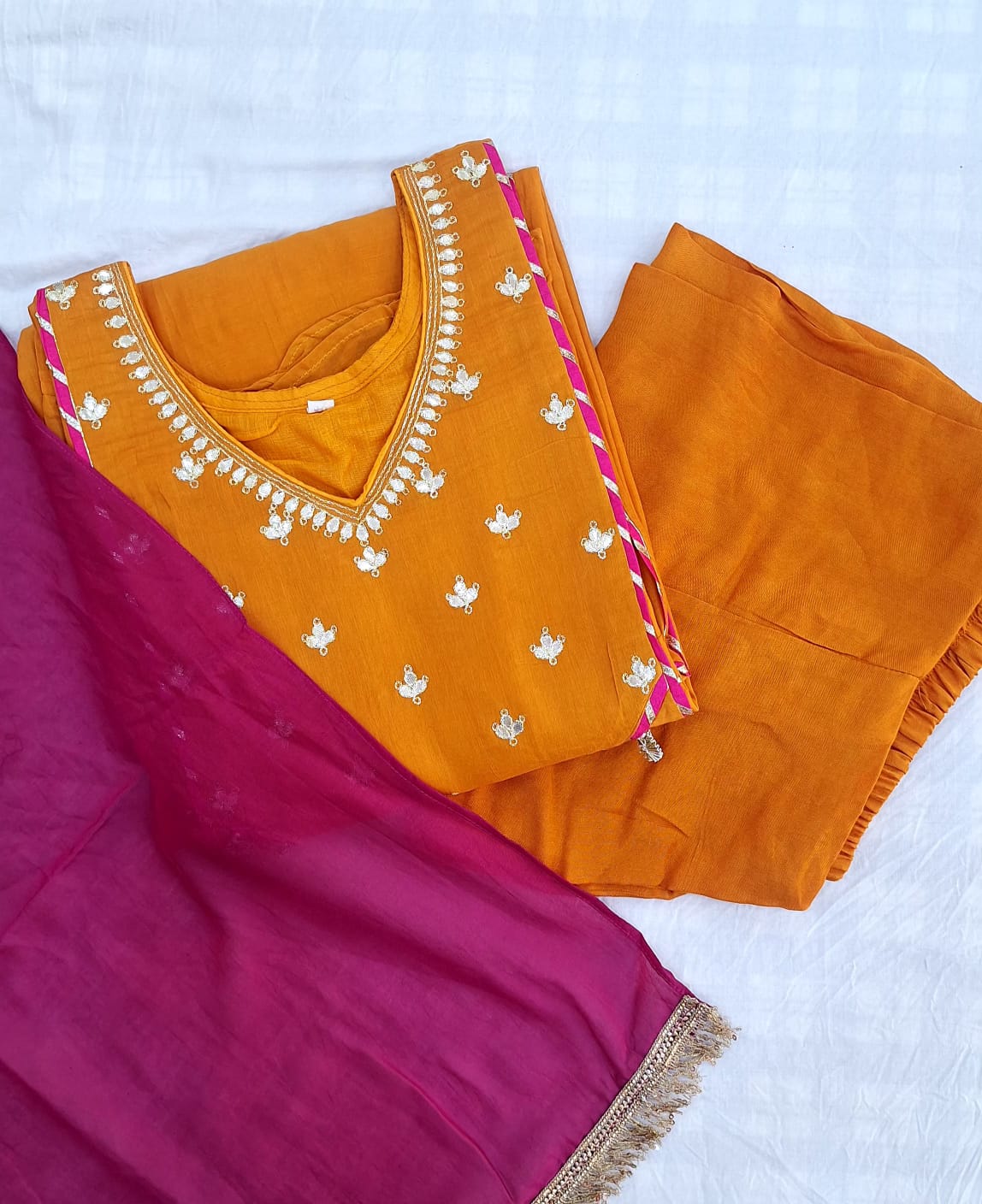 Add a vibrant touch to your ethnic wardrobe with this stunning Orange Mulchanderi Handwork Suit Set. Crafted from lightweight and breathable Mulchanderi fabric, this ensemble beautifully combines comfort with traditional elegance.
