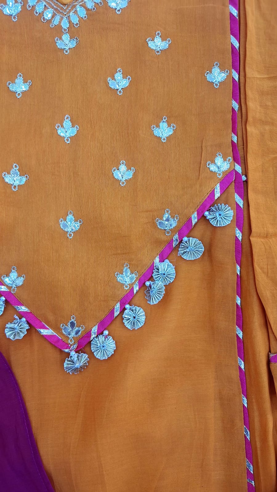 The kurta features intricate handwork detailing that enhances its rich orange hue, giving it a graceful and festive appeal. Paired with a complementing bottom and dupatta, this suit set is perfect for festive gatherings, family functions, and special occasions.