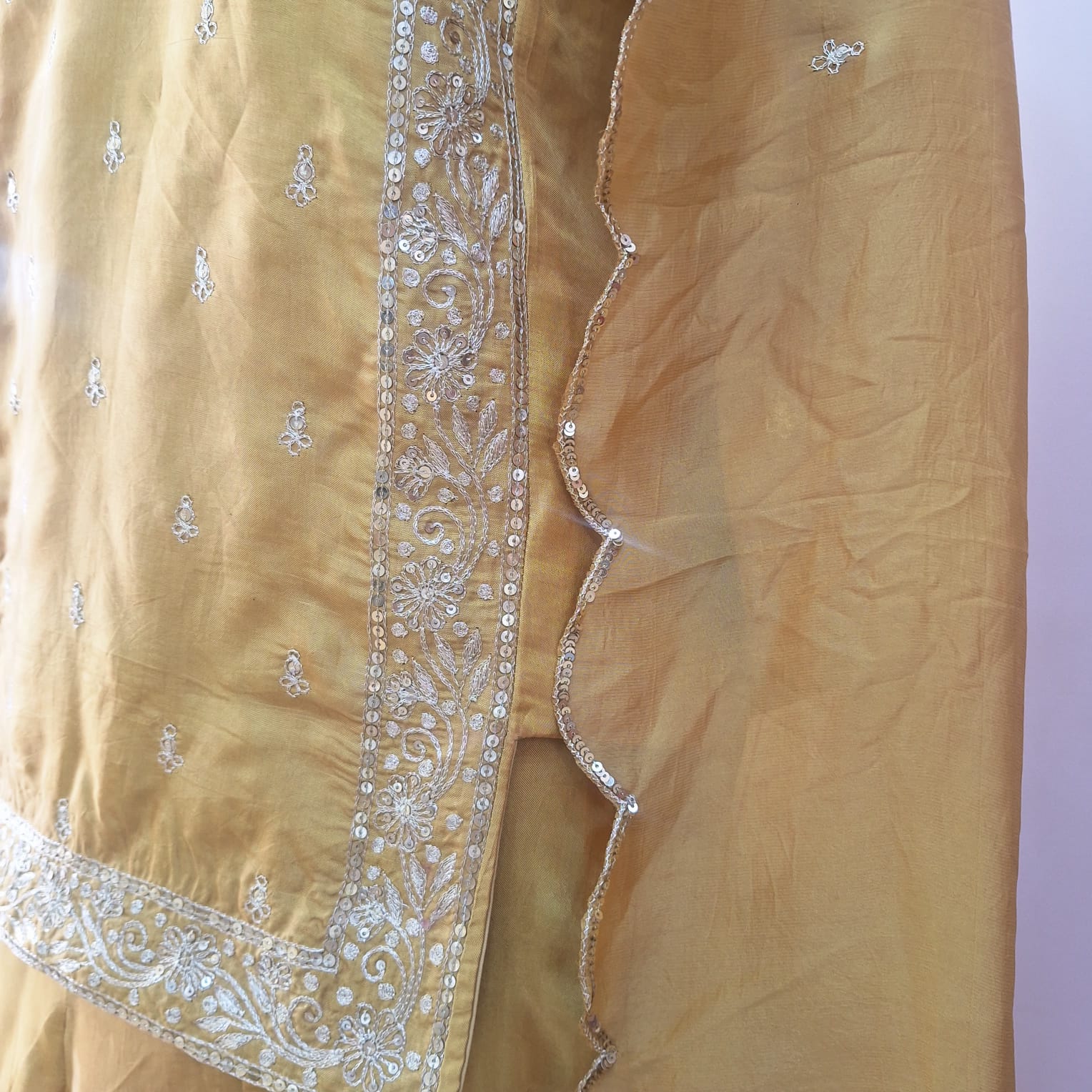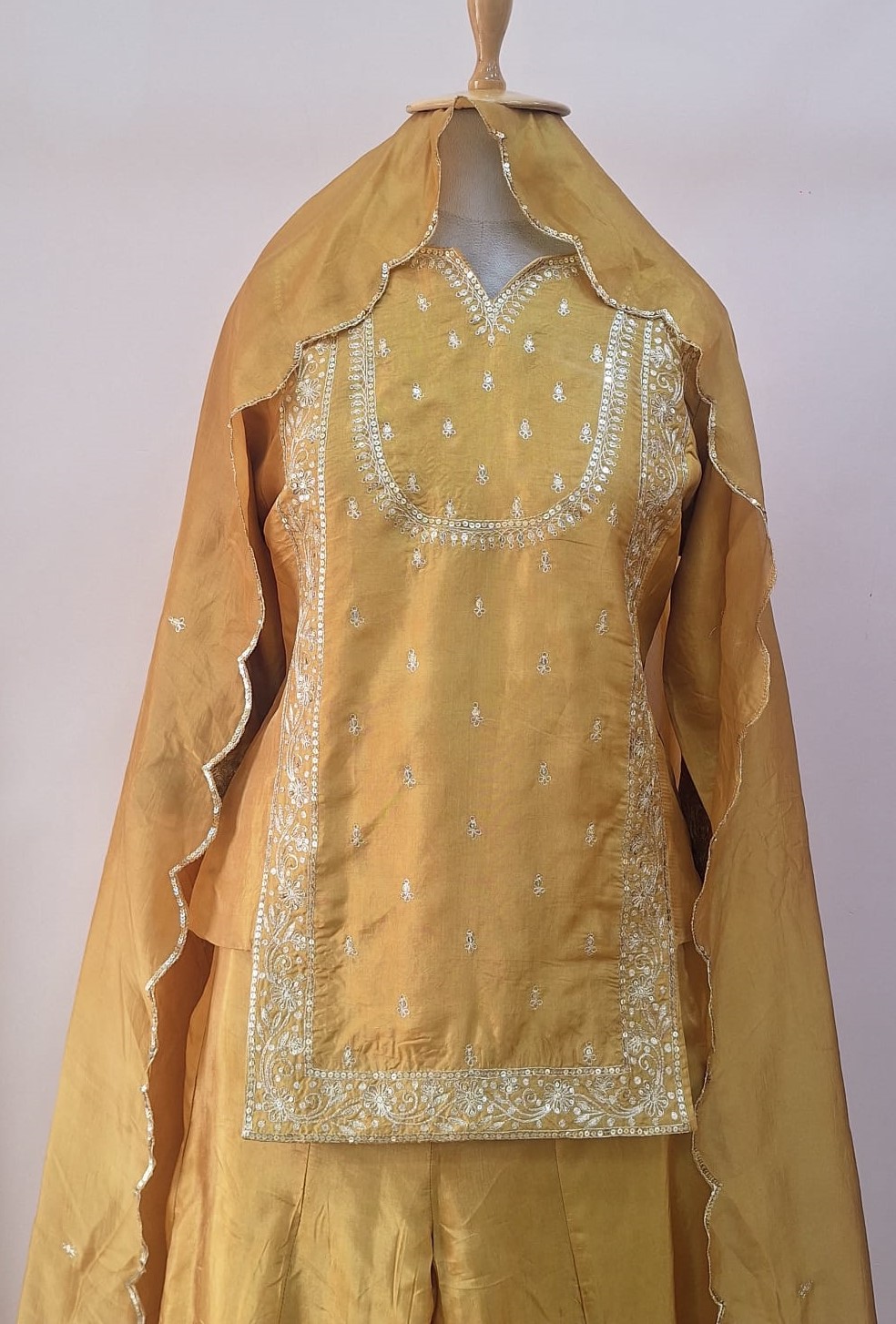 Brighten up your wardrobe with this elegant yellow Summer silk kurti set, crafted for effortless style and comfort. The short kurti features delicate handwork detailing of Sequins, Pitton and Booties that adds a touch of artisanal charm. Paired with a flared palazzo, the set offers a graceful silhouette and easy movement. Completing the ensemble is a matching dupatta that enhances its refined appeal. Perfect for festive gatherings, daytime celebrations, or casual ethnic wear, this outfit blends traditional craftsmanship with modern elegance.