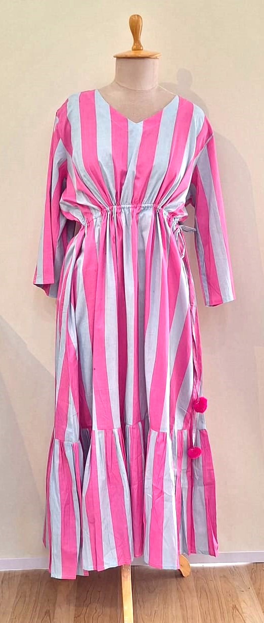 This elegant Pink and Grey striped cotton midi frock set is designed for effortless comfort and timeless style. Crafted from soft, breathable Cotton fabric, it ensures all-day freshness and ease of wear. The classic striped pattern adds a fresh, summery appeal, while the flattering midi length offers a graceful silhouette suitable for all body types. Featuring a relaxed yet structured fit, this frock is perfect for casual outings, brunches, day events, or everyday wear. Style it with flats for a laid-back look or dress it up with minimal accessories for a chic finish.