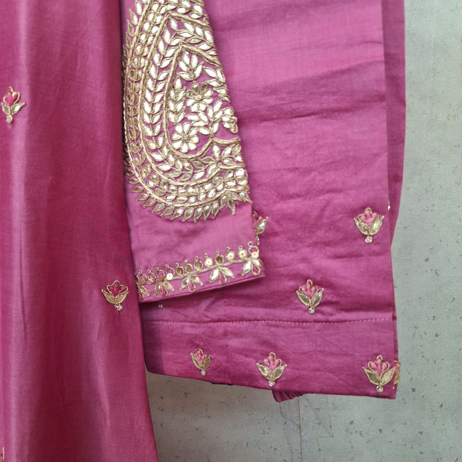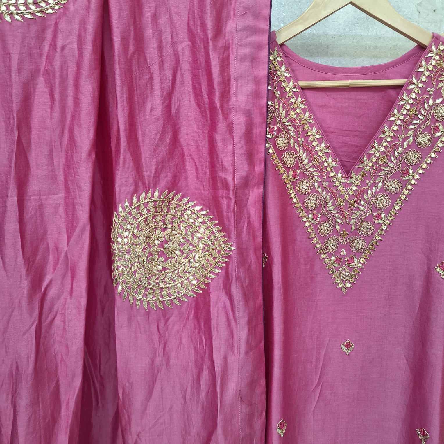 Elevate your ethnic wardrobe with this elegant Rose pink suit, pant and dupatta set with Summer Silk soft fabric, crafted to exude timeless charm. The suit is beautifully adorned with intricate handwork of Thread and Gota Patti, adding a touch of traditional artistry to the soft, feminine hue. Paired with a well-fitted pant, the ensemble offers both comfort and a flattering silhouette. The matching dupatta completes the look with delicate detailing, making it perfect for festive occasions, celebrations, and graceful daytime events. Style it with minimal jewelry and soft makeup for a refined, sophisticated appearance.
