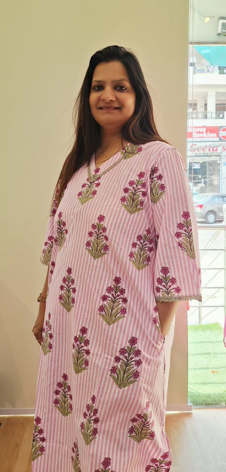 Add a fresh and graceful charm to your wardrobe with this beautiful Pink & White Stripes with Floral Cotton Print Kurti Pant Set. Crafted from soft and breathable cotton fabric, this outfit ensures all-day comfort while keeping your look stylish and elegant. The kurti features a lovely combination of pink and white stripes enhanced with delicate floral prints, giving it a vibrant and feminine appeal.