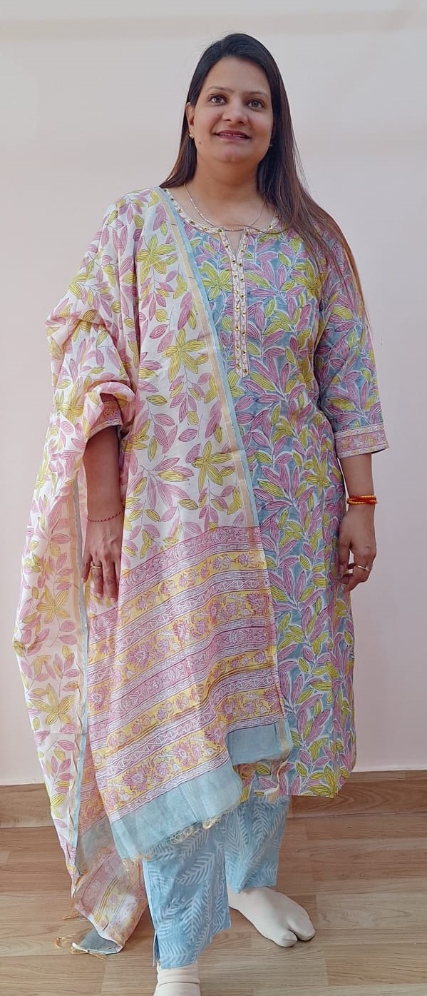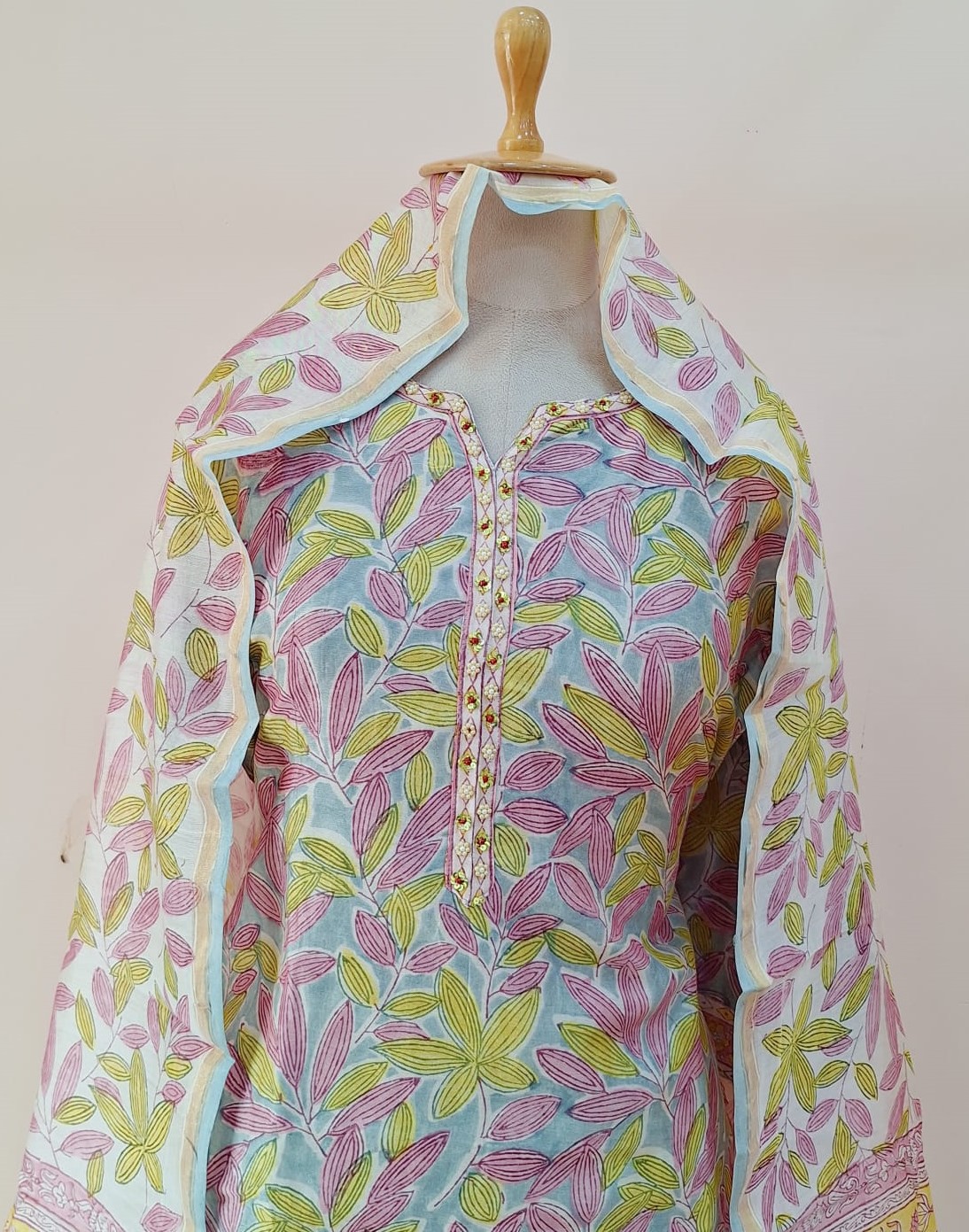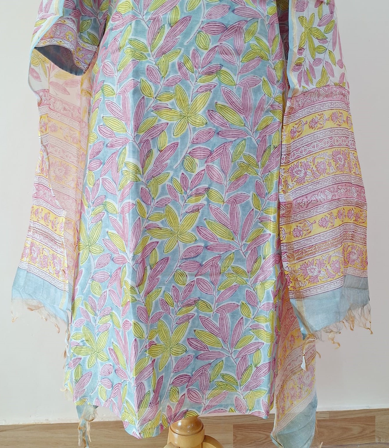 The Multi Printed Chanderi Suit Set features a soft, lightweight Chanderi kurti enhanced with delicate handwork of Sequins and Pearl. It is paired with a matching pant for a comfortable and refined fit. A coordinated Chanderi dupatta with subtle handwork completes the graceful ensemble. Perfect for festive gatherings, daytime functions, and elegant ethnic wear.