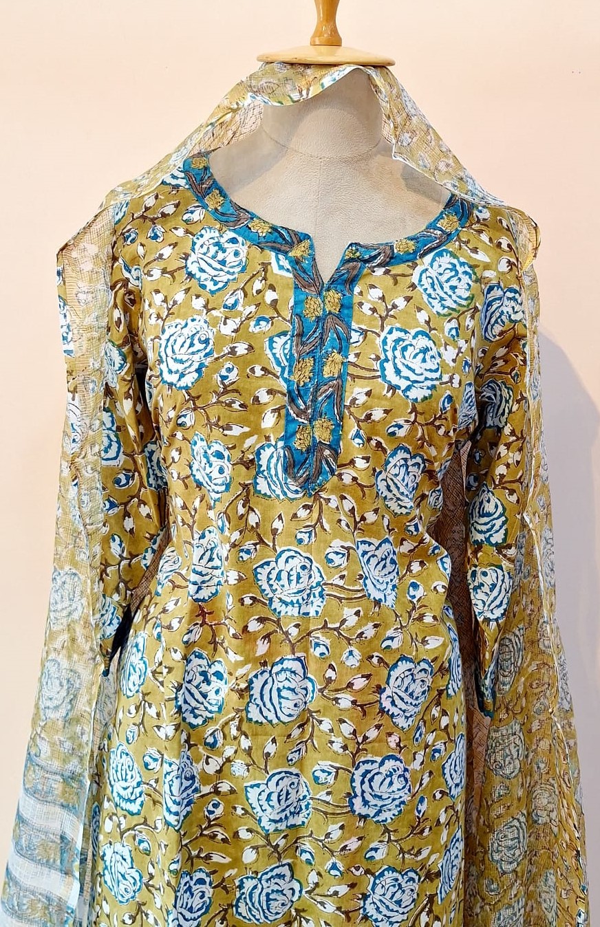 Elegant Olive Green Printed Cotton suit adorned with delicate printed detailing for a rich festive look. Paired with perfectly tailored matching pants for a sleek and graceful silhouette. Lightweight Cotton dupatta adds a soft, flowy charm with its beautifully coordinated print. Ideal for festive occasions, family functions and stylish evening wear.