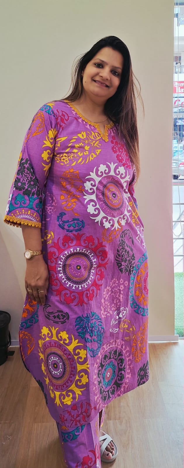 Add a touch of elegance to your everyday wardrobe with this beautiful Purple Cotton Print Kurti Pant Set. Crafted from soft and breathable cotton fabric, this outfit offers all-day comfort while keeping your style effortlessly graceful. The kurti features a charming purple print that enhances its traditional yet modern appeal, making it perfect for daily wear, office looks, or casual outings.