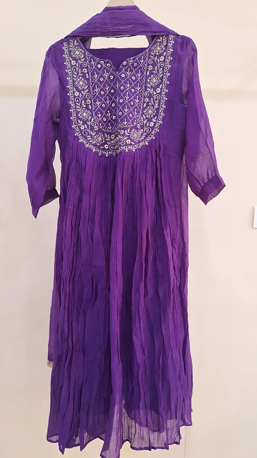 Step into elegance with this regal Purple Mulchanderi Suit Set, a perfect blend of tradition and grace. The kurta features a beautifully crafted yoke embellished with intricate cutdana, sequin, and thread handwork, adding a touch of refined sparkle and artisanal charm. Made from lightweight and breathable Mulchanderi fabric, the set drapes effortlessly, offering comfort without compromising on style. Paired with matching bottoms and a complementing dupatta, this ensemble is ideal for festive occasions, intimate gatherings, and traditional celebrations where sophistication speaks through subtle detailing.