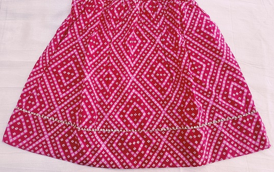 Vibrant rani cotton frock set featuring traditional Bhandhej print, beautifully embellished with gota lace detailing. Made from soft, breathable cotton to ensure comfort and style, this festive kids set is perfect for celebrations, weddings, and special occasions.