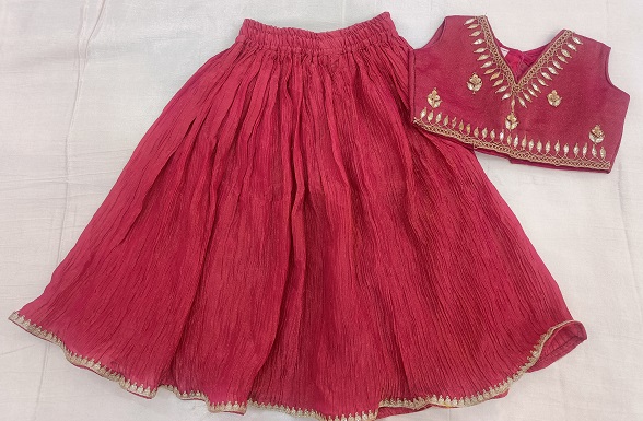 Make festive dressing extra special with this charming rani-colored kids set, crafted in elegant crush tissue fabric. The top features exquisite gota-patti handwork, adding a shimmering traditional touch that beautifully complements the rich color and texture. Paired with a matching crush tissue skirt for a graceful flared silhouette and a coordinated dupatta to complete the ethnic charm. Perfect for weddings, festive celebrations, and family gatherings.