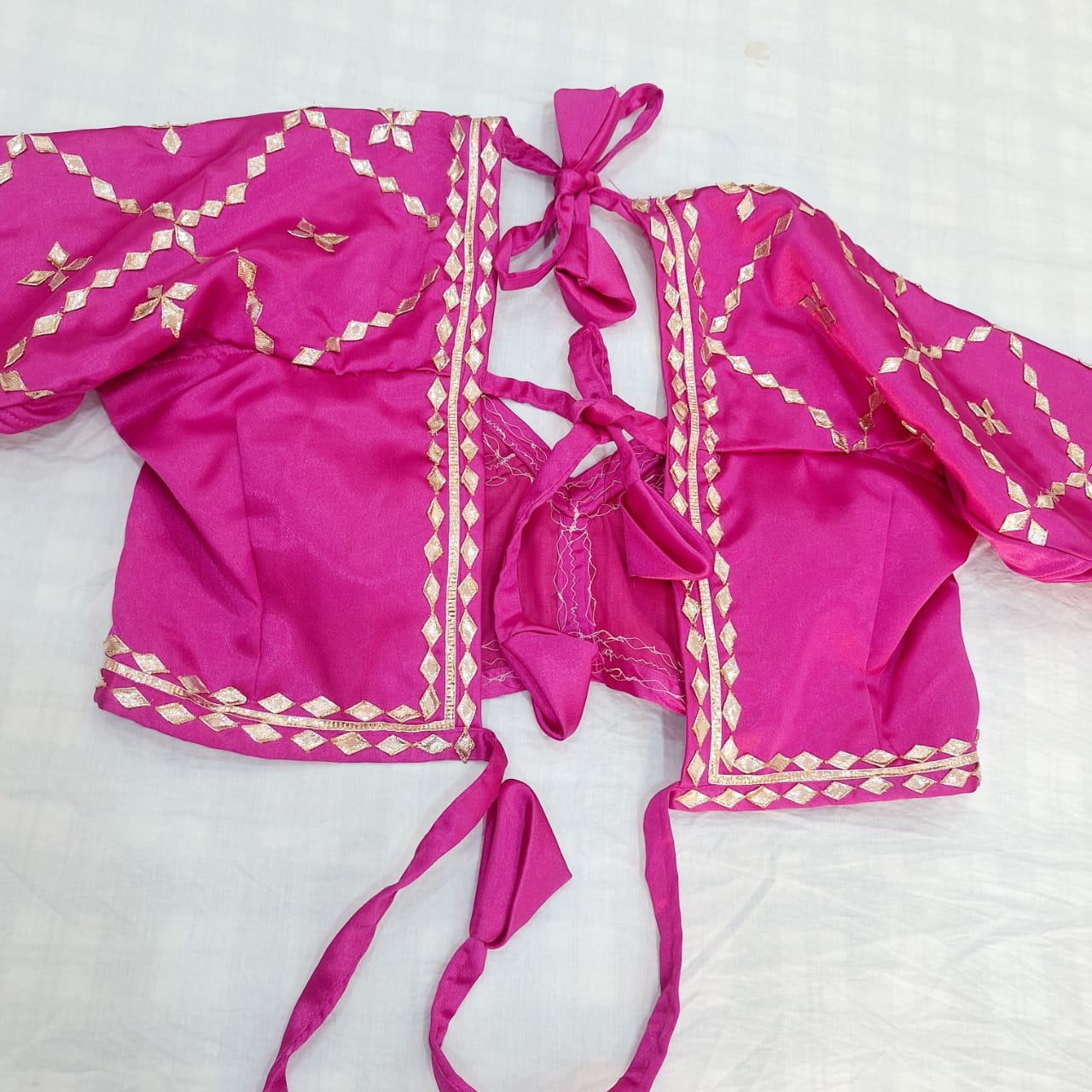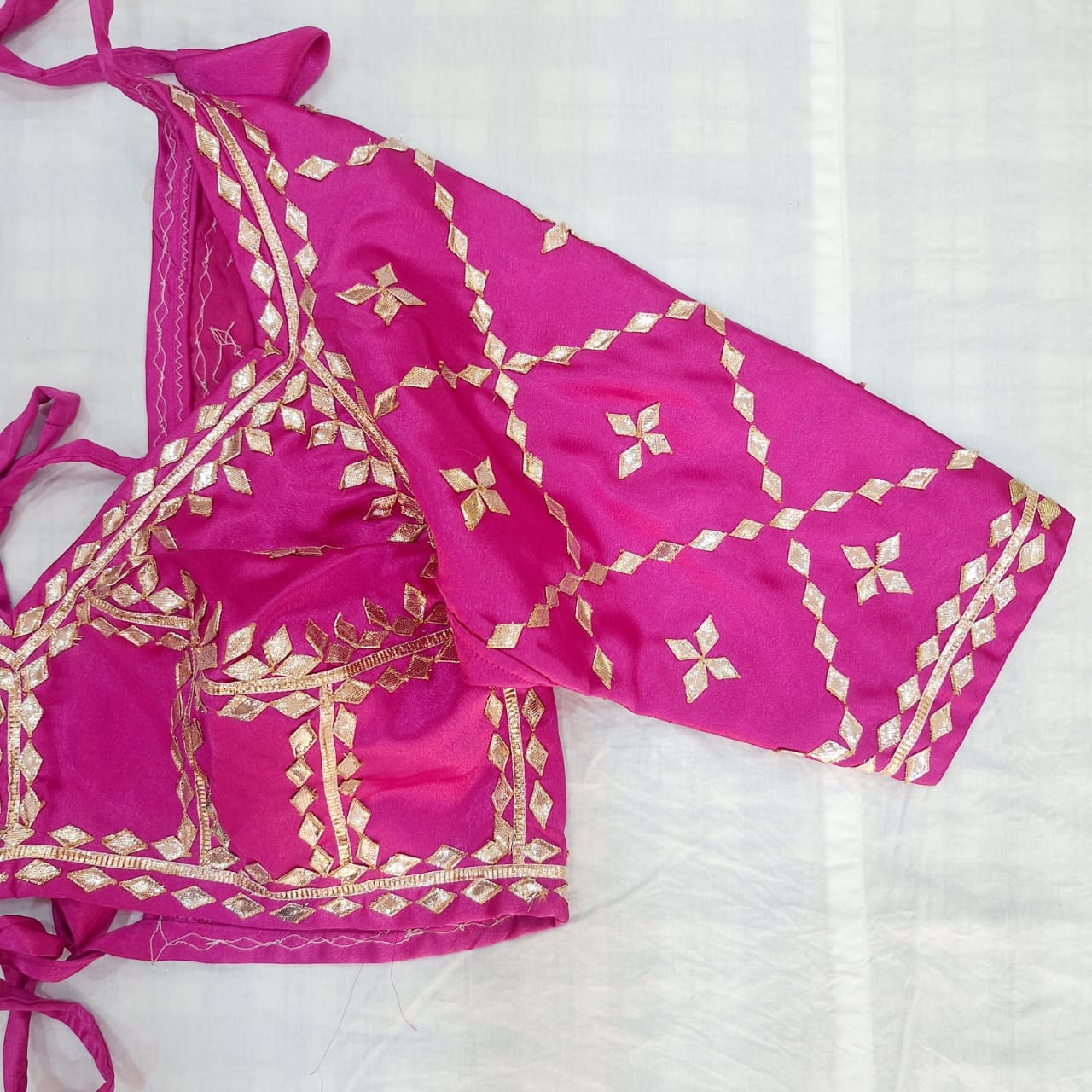 A vibrant rani-pink blouse beautifully adorned with exquisite handwork, featuring intricate detailing in kachha gotta. Crafted to perfection, this blouse adds a rich festive charm and pairs seamlessly with sarees or lehengas. Designed with a flattering fit and premium finishing, it’s ideal for weddings, celebrations, and traditional occasions.