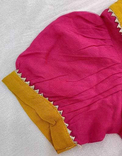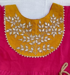 A vibrant rani-pink kids frock adorned with intricate handwork, crafted to bring charm and elegance to festive dressing. Featuring delicate embellishments like gotapatti and fine detailing that adds a premium handcrafted finish. Made from soft, comfortable fabric to ensure ease of movement, this frock is perfect for weddings, celebrations, and special occasions.