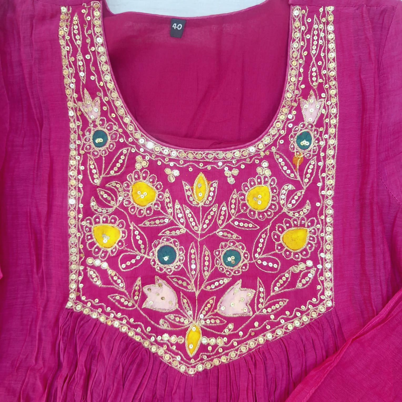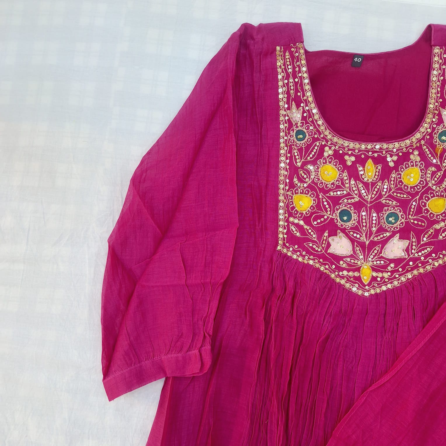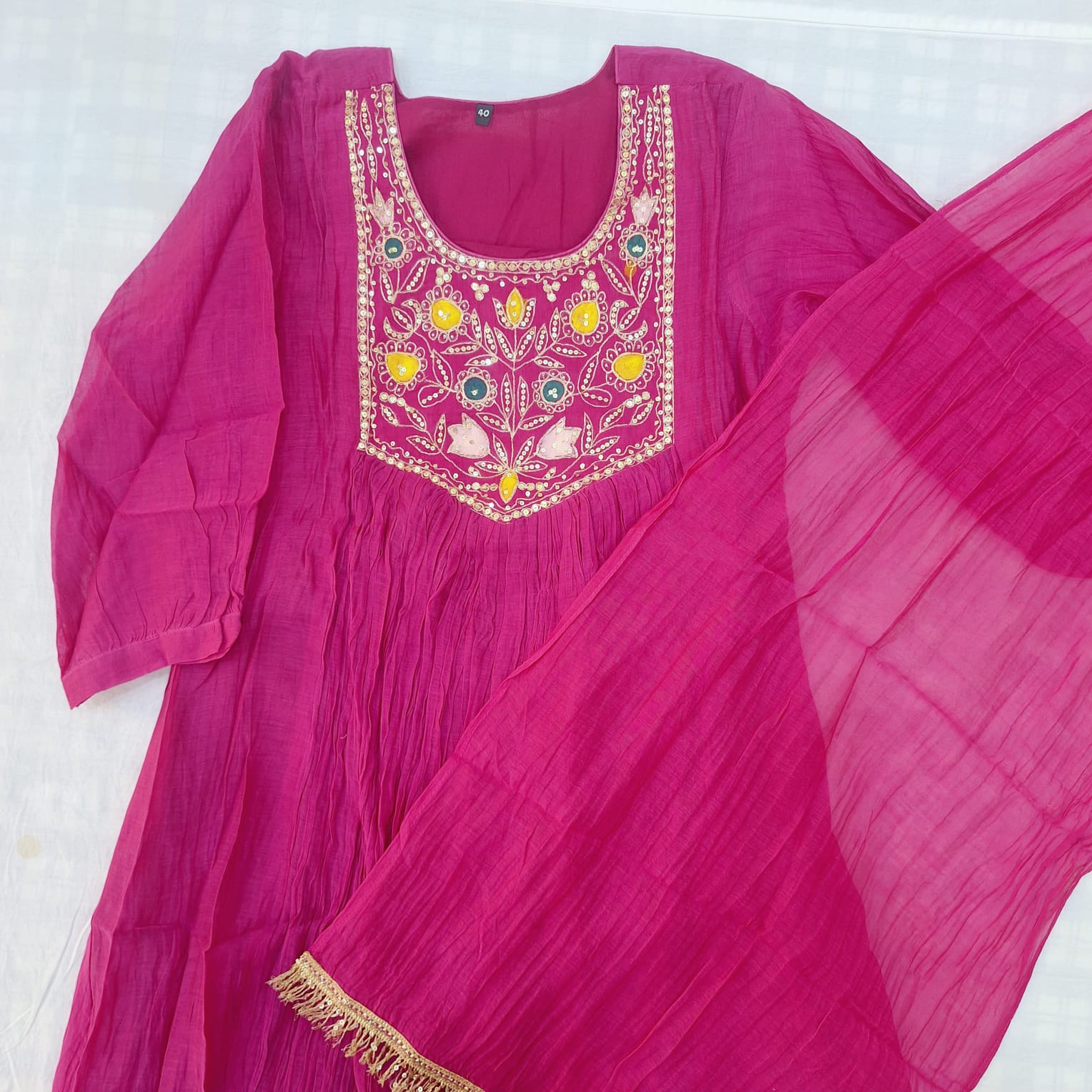 Step into elegance with this Rani Mul chanderi Suit, pant and dupatta Set, a perfect blend of tradition and grace. The Suit features a beautifully crafted handwork of sequins and pearl adding a touch of refined sparkle and artisanal charm. Made from lightweight and breathable Mul chanderi fabric, the set drapes effortlessly, offering comfort without compromising on style. Paired with matching bottoms and a complementing dupatta, this ensemble is ideal for festive occasions, intimate gatherings, and traditional celebrations where sophistication speaks through subtle detailing.