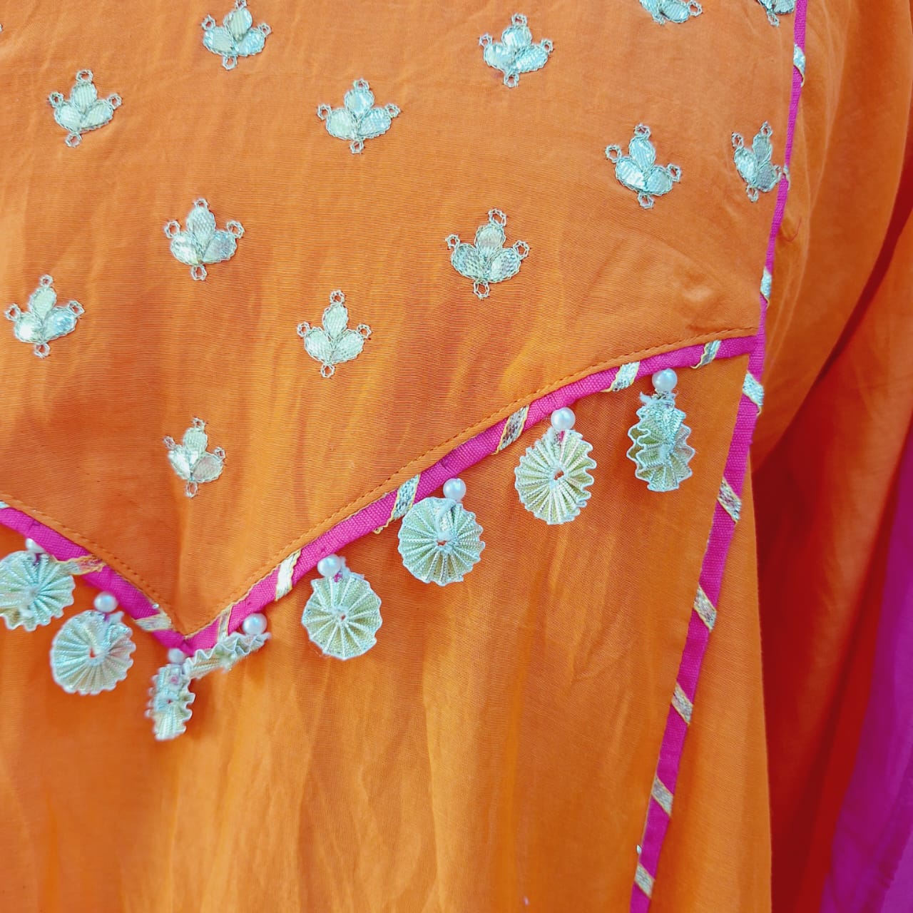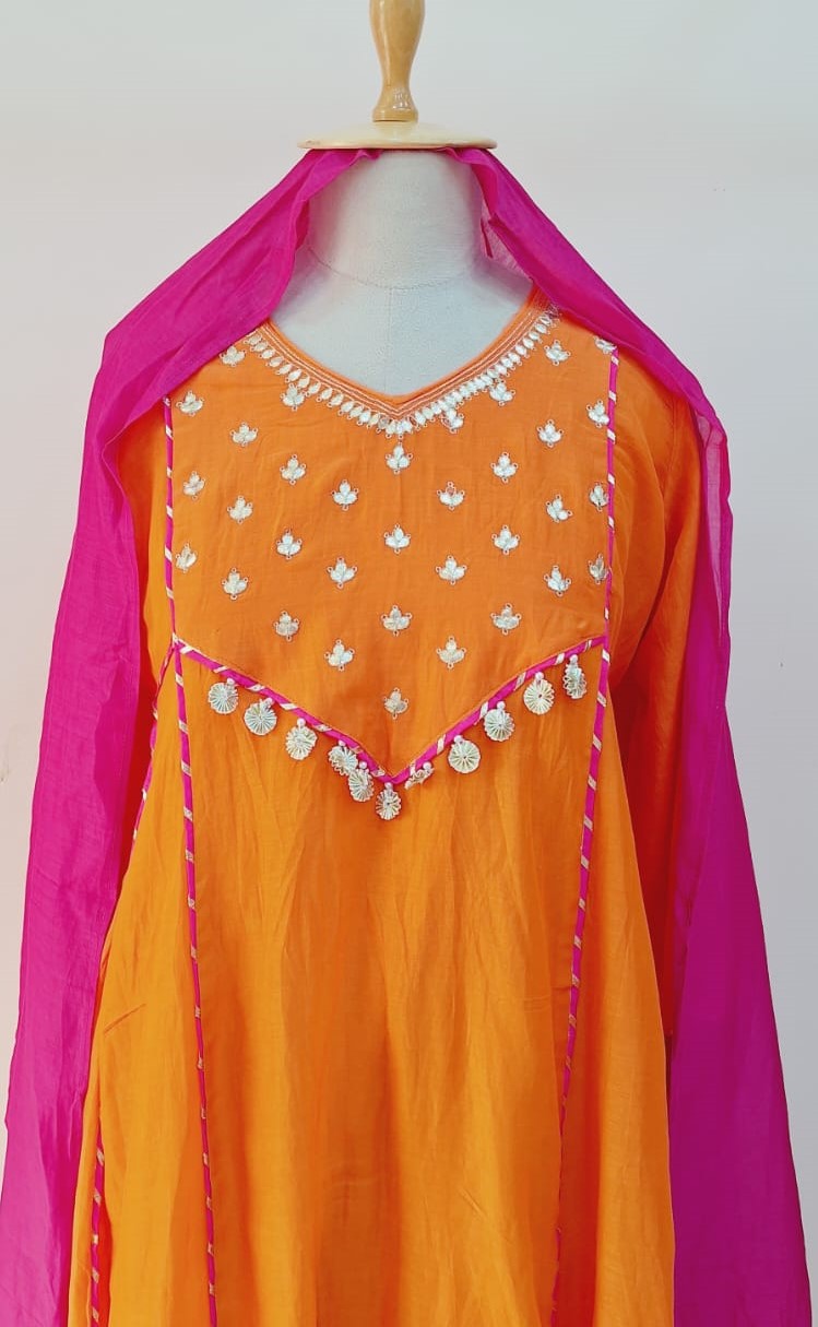This vibrant rani orange ethnic ensemble features a beautifully designed suit (kurta) paired with a stylish pant and a matching dupatta, making it a perfect choice for festive and traditional occasions. The kurta is enhanced with intricate hand embroidery of Gota Patti, showcasing fine craftsmanship through detailed threadwork and subtle embellishments that add richness and elegance to the outfit. Its flattering silhouette ensures comfort while exuding a regal appeal. The pant is tailored for a clean and contemporary fit, offering ease of movement and complementing the kurta effortlessly. Crafted from premium-quality fabric of Mul Chanderi, it balances comfort with refined style. Completing the look, the matching dupatta adds grace with delicate handwork and refined borders, bringing harmony and sophistication to the ensemble. Ideal for festive celebrations, weddings, cultural functions, and special occasions, this rani orange handwork suit set radiates traditional charm and timeless elegance. Style it with statement jewelry and ethnic footwear for a striking and polished appearance.