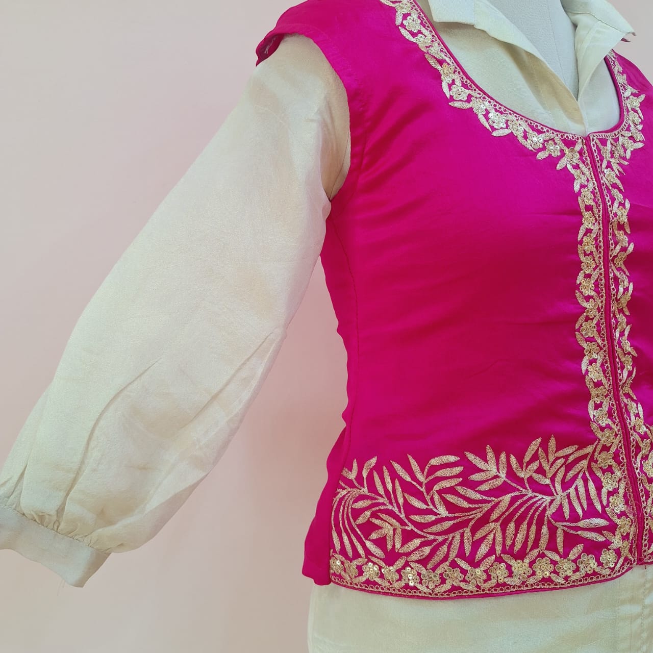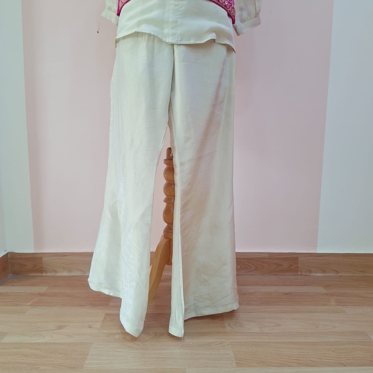 Make a stylish festive statement with this beautiful Rani Pink & White Handwork Shirt Bell Bottom with Koti Set with Tissue and Pure tussar fabric. The bold rani pink top paired with crisp white bottoms and an intricately crafted koti creates a perfect fusion of contemporary fashion and traditional elegance.