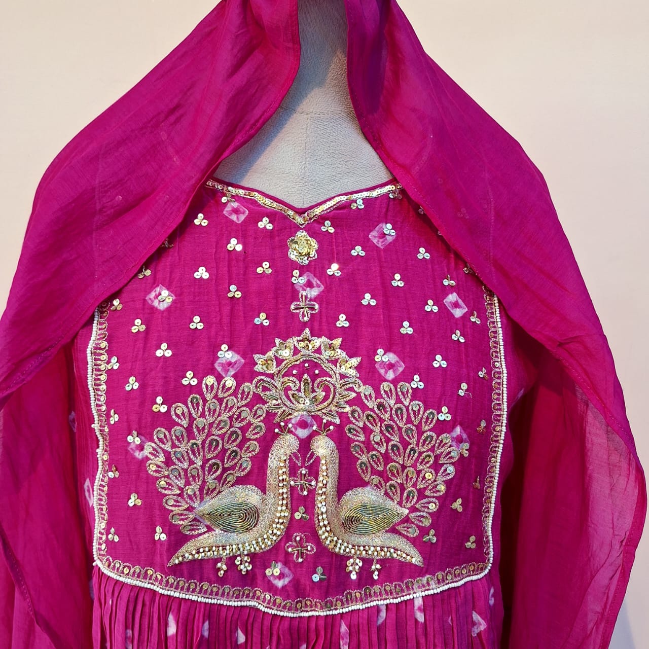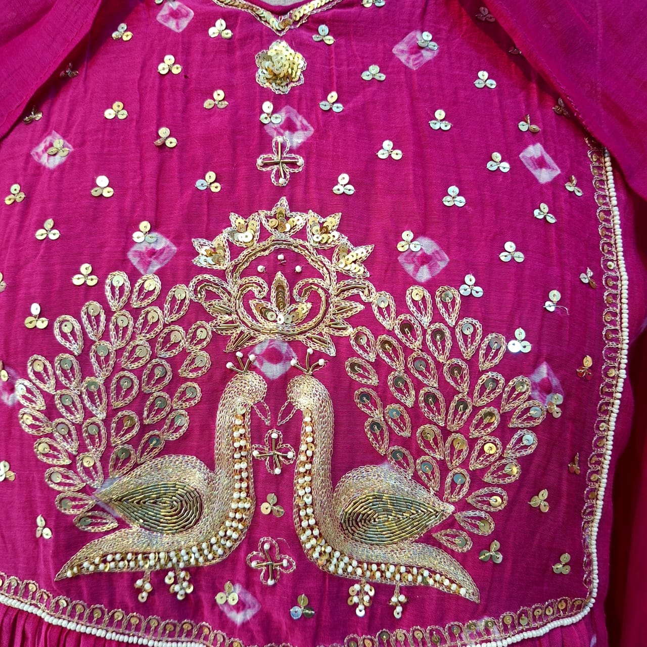 Make a statement in this vibrant rani pink three-piece ensemble, crafted in luxurious Mul Chanderi fabric for a soft, airy, and elegant drape. The kurti is adorned with handcrafted Patton embroidery, pearl accents, and sequins, creating a subtle yet festive shimmer that adds artisanal charm. Styled with a matching pant and a coordinated dupatta, this set is perfect for weddings, festivals, and special daytime celebrations.
