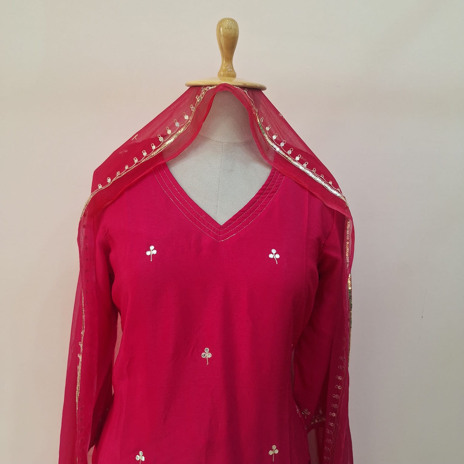 Make a vibrant style statement with this stunning Rani Pink Suit Set, beautifully adorned with intricate handwork. The rich, bold shade pairs perfectly with the detailed embellishments, creating an elegant festive look. Complete with matching pants and a coordinated dupatta, this ensemble blends tradition and contemporary charm effortlessly.