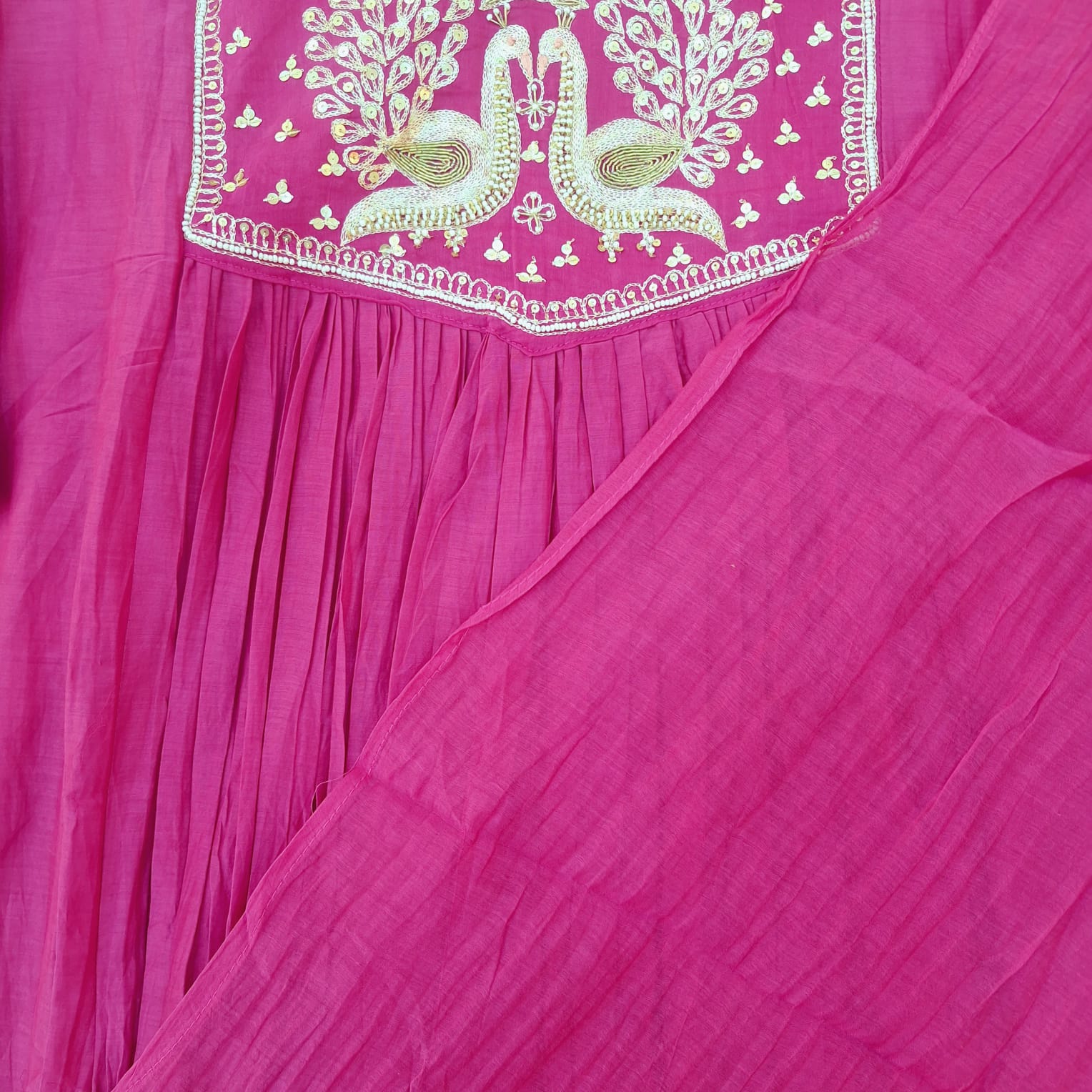 Step into elegance with this Rani pink Mul chanderi Suit, pant and dupatta Set, a perfect blend of tradition and grace. The Suit features a beautifully crafted handwork of sequins , pearl and zardozi adding a touch of refined sparkle and artisanal charm. Made from lightweight and breathable Mul chanderi fabric, the set drapes effortlessly, offering comfort without compromising on style. Paired with matching bottoms and a complementing dupatta, this ensemble is ideal for festive occasions, intimate gatherings, and traditional celebrations where sophistication speaks through subtle detailing.