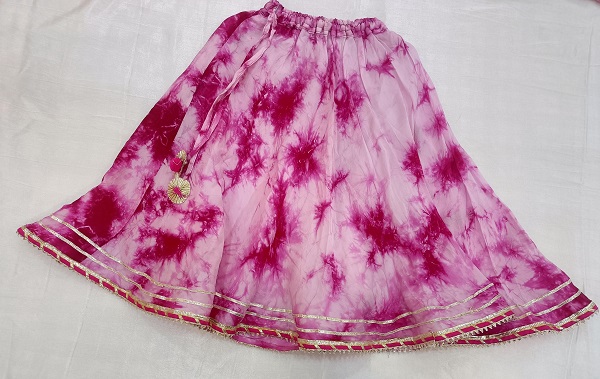 Rani-shaded tie and dye top and skirt set beautifully crafted for a vibrant festive look. The outfit features exquisite Magji and Gota detailing that adds a traditional touch to the ensemble. Paired with a matching dupatta adorned with Magji and Gota design, this set perfectly blends modern style with ethnic elegance — ideal for festive celebrations, weddings, and special occasions.