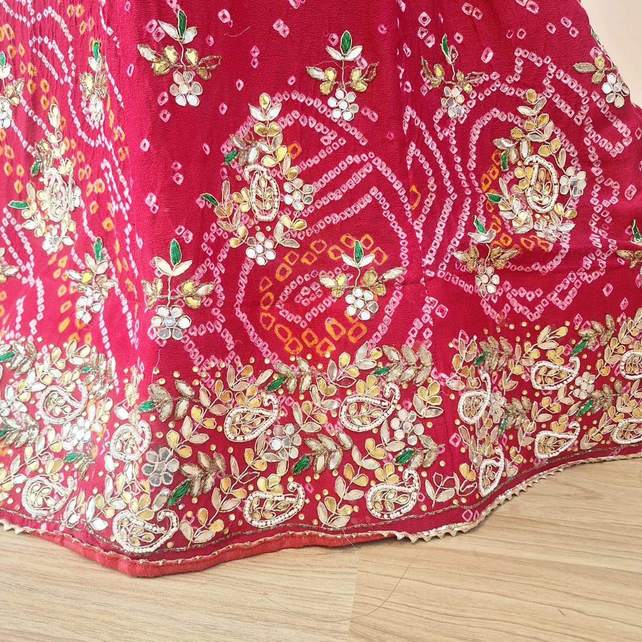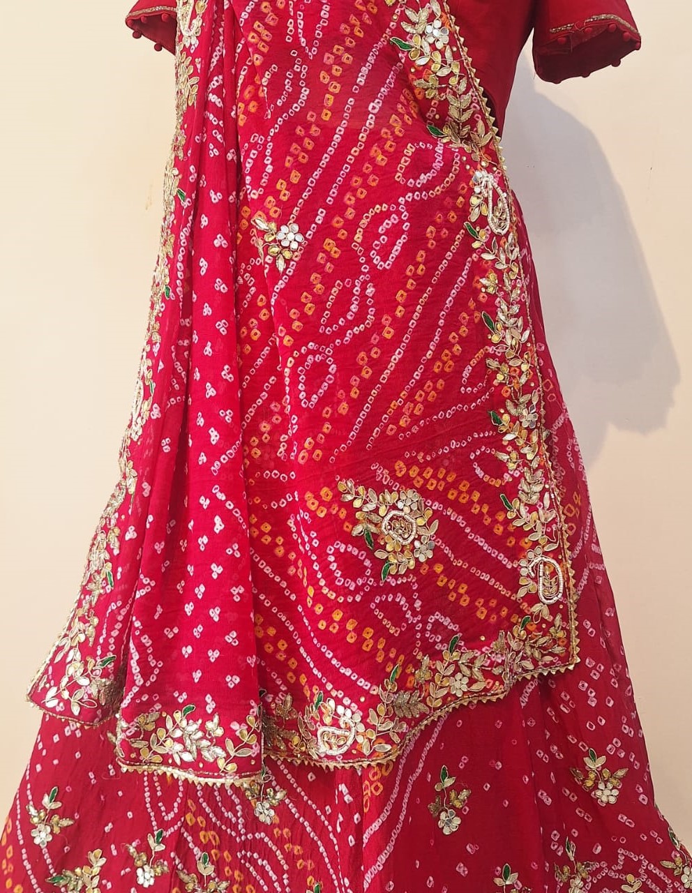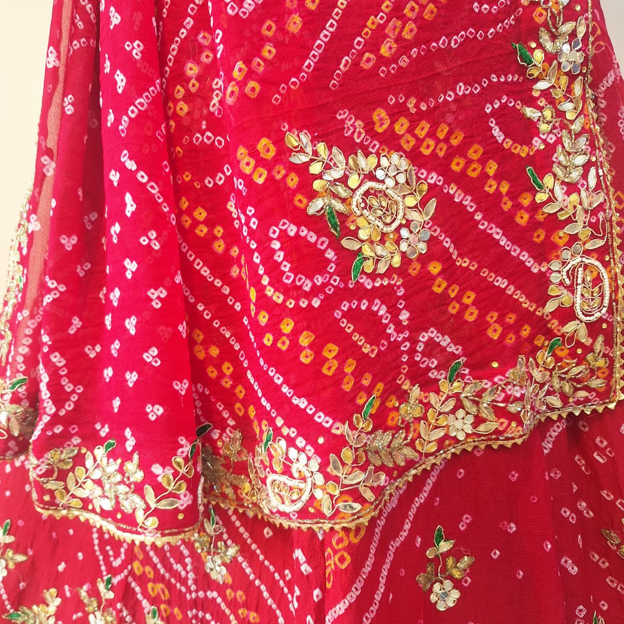Make a striking statement with this Red Lehenga set crafted in pure Bandhej fabric, a timeless expression of traditional artistry. The lehenga showcases classic Bandhej patterns, richly enhanced with exquisite hand embellishments including Cutdana, Sequins, Gota Patti, Pearl accents, intricate Thread work, Mirror work, and Patra detailing, creating a captivating blend of texture and shimmer. The meticulously designed blouse mirrors the same artisanal craftsmanship, while the coordinated dupatta completes the ensemble with effortless grace. Ideal for weddings, sangeet, and festive celebrations, this set embodies heritage elegance, vibrant color, and opulent detailing.