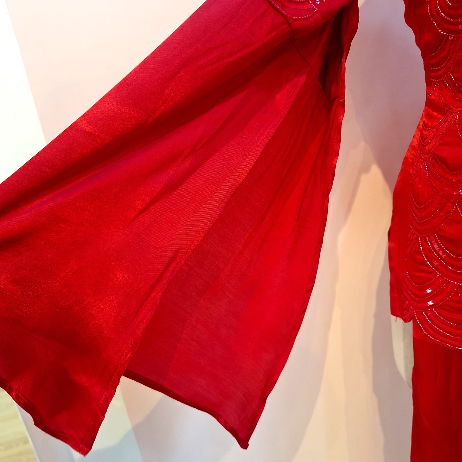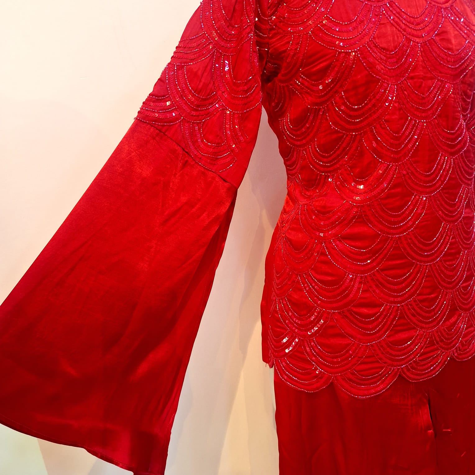 Make a bold style statement with this exquisite Red Gajji Silk Top and Pants Set, crafted from rich and lustrous gajji silk. The top is beautifully adorned with intricate Cutdana and Sequin handwork, adding a subtle shimmer and refined artisanal elegance. Designed to catch the light gracefully, the embellishments enhance the overall festive appeal of the ensemble. The coordinated pants offer a tailored yet comfortable fit, perfectly balancing glamour with ease. Ideal for weddings, festive celebrations, and special occasions, this ensemble blends traditional craftsmanship with contemporary sophistication.