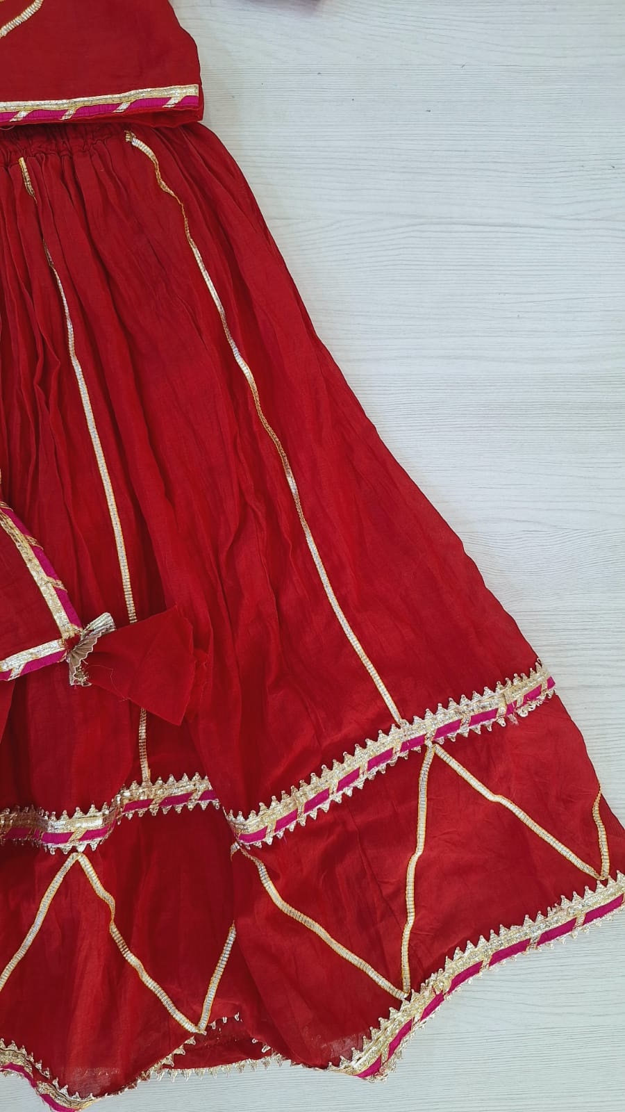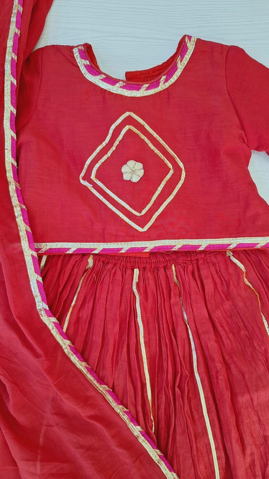 This elegant kids ethnic set is crafted in rich red mul chanderi fabric, known for its soft texture and graceful sheen. The top is beautifully enhanced with delicate handwork embroidery, adding a traditional yet charming touch suitable for festive occasions. The matching skirt features a comfortable fit with a graceful flare, allowing easy movement for little ones. Paired with a coordinated dupatta, this three-piece set creates a complete and stylish ethnic look. Perfect for festivals, weddings, family functions, and special celebrations, this outfit blends comfort, tradition, and timeless elegance for kids.