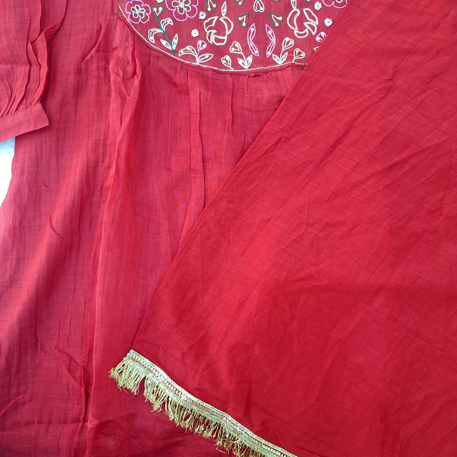 Step into elegance with this Red Mul chanderi Suit, pant and dupatta Set, a perfect blend of tradition and grace. The Suit features a beautifully crafted handwork of Sequins, Pearl and Cutdana adding a touch of refined sparkle and artisanal charm. Made from lightweight and breathable Mul chanderi fabric, the set drapes effortlessly, offering comfort without compromising on style. Paired with matching bottoms and a complementing dupatta, this ensemble is ideal for festive occasions, intimate gatherings, and traditional celebrations where sophistication speaks through subtle detailing.