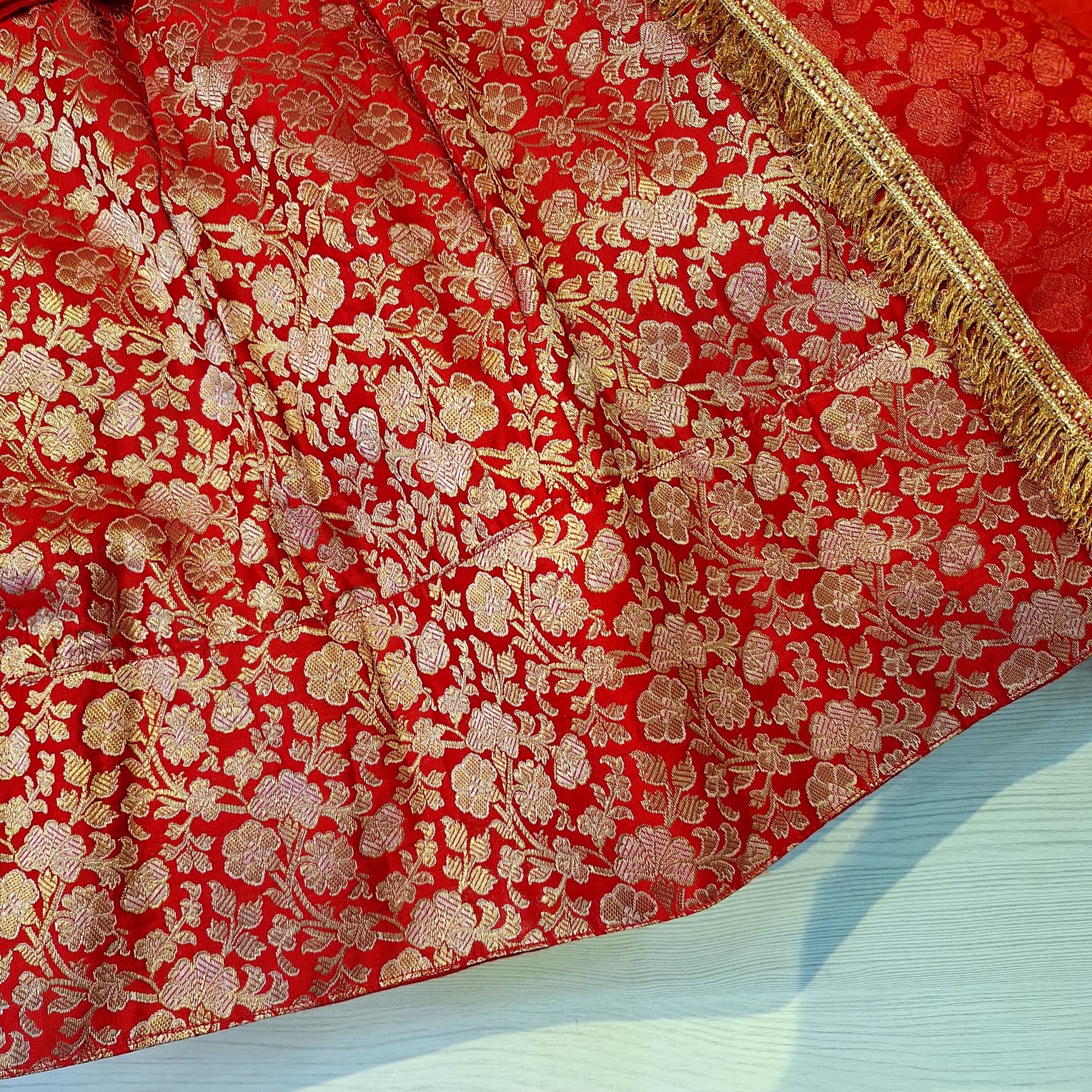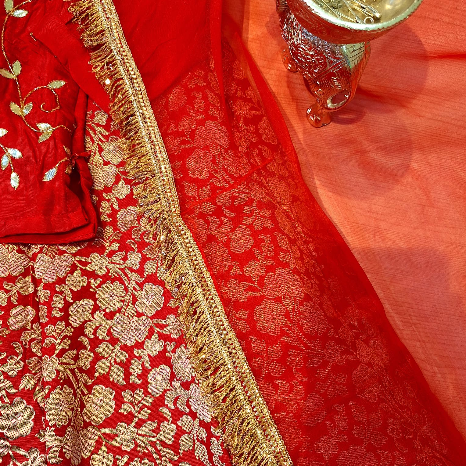 Dress your little one in timeless elegance with this beautifully crafted Red Summer Silk Kids Set. The outfit features a finely tailored top adorned with delicate handwork of Cutdana and Gota patti, paired with a matching flared skirt that adds a graceful festive charm. Completing the set is a soft, lightweight dupatta that enhances the traditional appeal. Made from premium summer silk, this ensemble is comfortable, breathable, and perfect for long wear. Ideal for festivals, weddings, family functions, and special occasions, this kids set blends traditional craftsmanship with modern comfort.