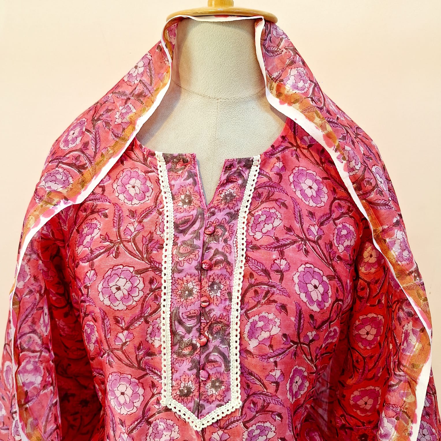 Elegant Peach Chanderi suit adorned with delicate printed detailing for a rich festive look. Paired with perfectly tailored matching pants for a sleek and graceful silhouette. Lightweight Chanderi dupatta adds a soft, flowy charm with its beautifully coordinated print. Ideal for festive occasions, family functions and stylish evening wear.