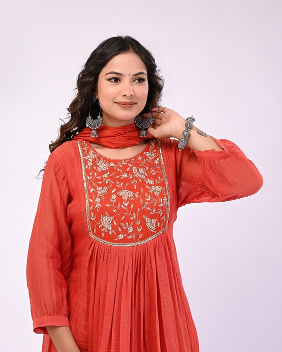 The Rust Orange Handwork Mulchanderi Suit Set is a beautiful ode to effortless summer style. Crafted in airy and breathable mulchanderi fabric, this outfit is perfect for warm days. The intricate handwork lends a subtle sparkle, adding elegance without overwhelming the look. The rich rust orange tone brings a warm, earthy glow that complements the season’s natural palette. Perfect for summer festivities, intimate gatherings, or day events, this suit set is where comfort meets timeless grace.