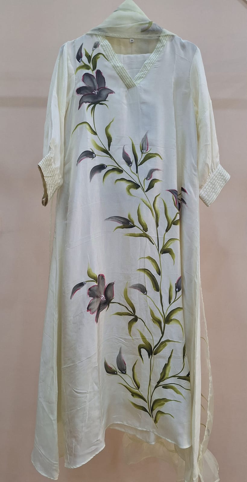 Embrace effortless elegance with this pristine white summer silk suit set, featuring graceful hand-painted detailing that reflects artisanal craftsmanship and timeless charm. The look is completed with a beautifully coordinated hand-painted organza dupatta, offering a soft, ethereal finish to the ensemble.