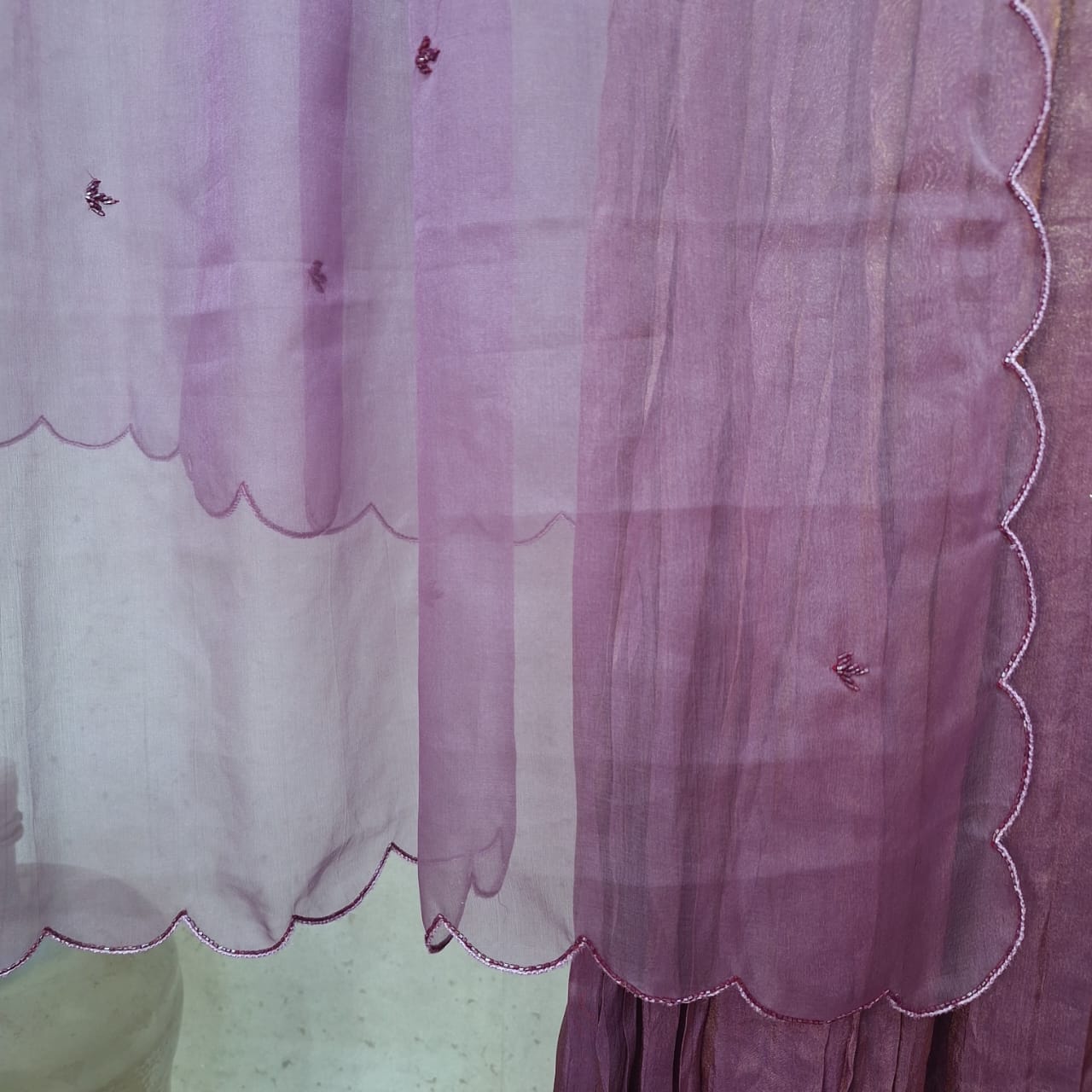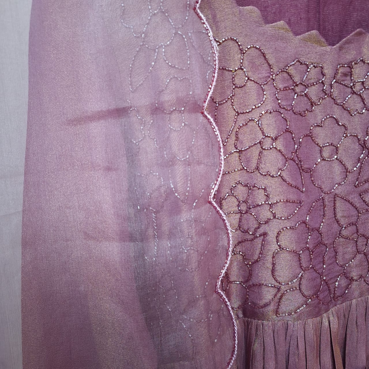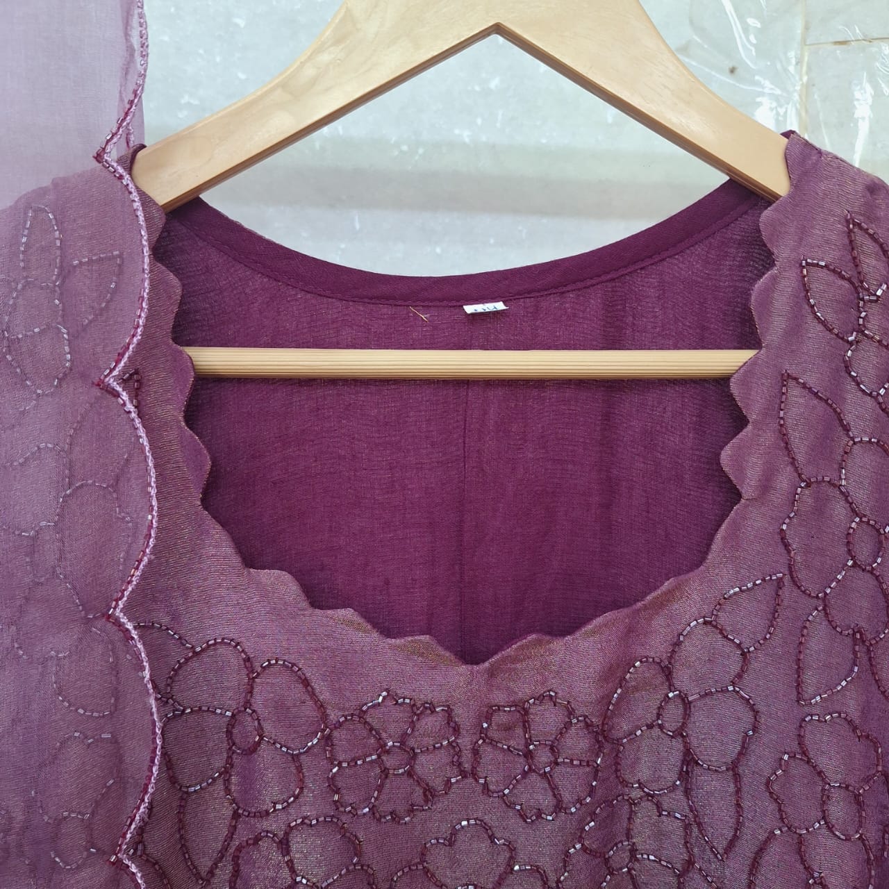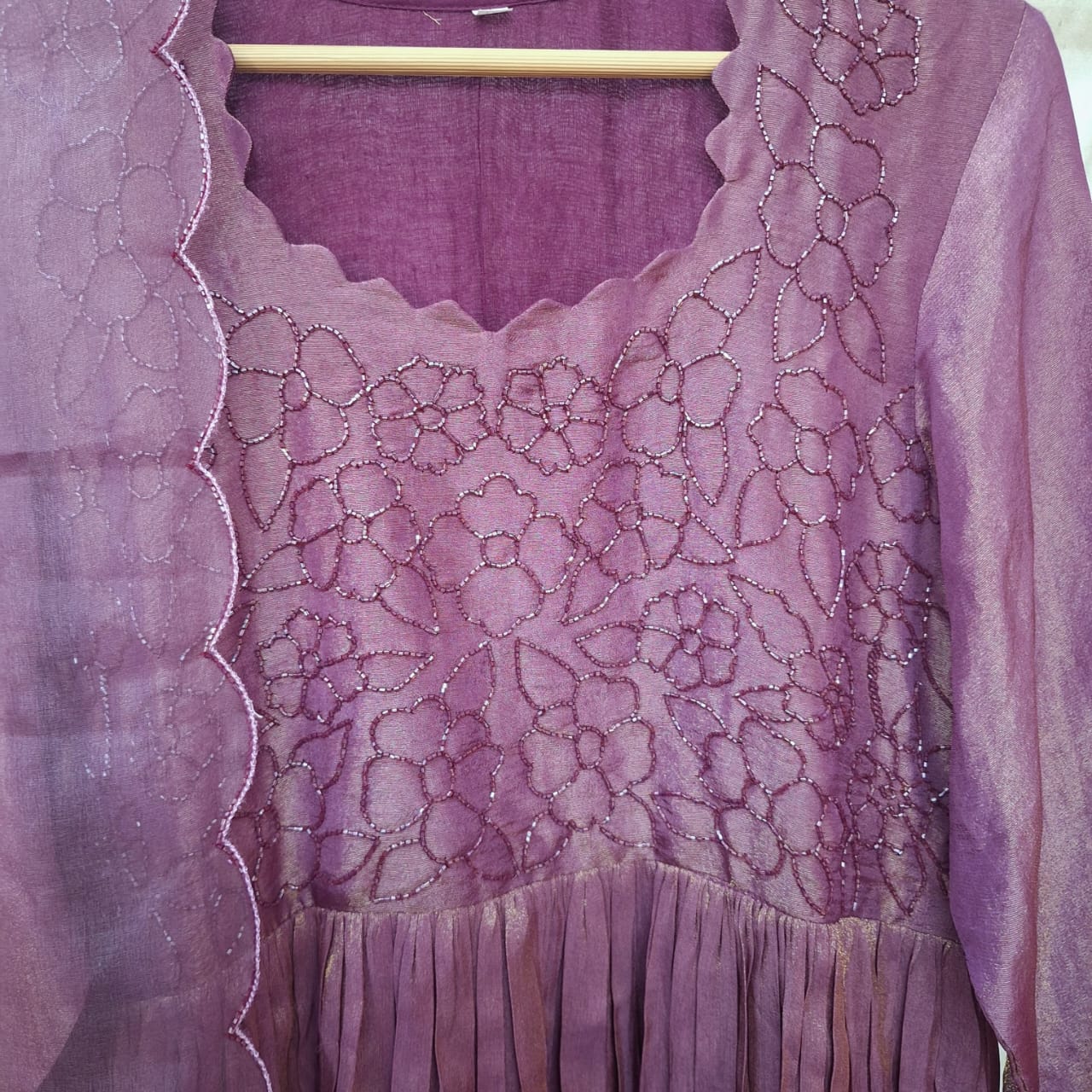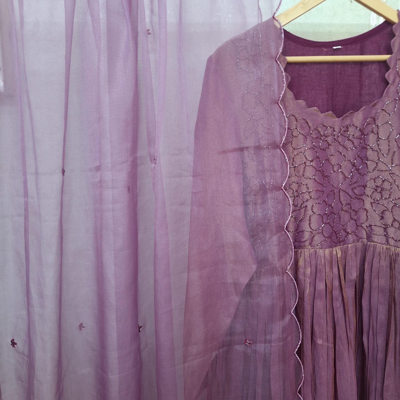 Make a graceful statement with this elegant Purple Wine Tissue One Piece and Dupatta Set. Crafted from delicate tissue fabric, the one piece is beautifully enhanced with intricate handwork of Cutdana that adds subtle shimmer and traditional charm. Paired with a matching lightweight dupatta, this ensemble offers a refined and festive appeal. Perfect for weddings, festive celebrations, and special occasions, the rich purple wine shade combined with fine craftsmanship makes this set a timeless addition to your ethnic wardrobe.
