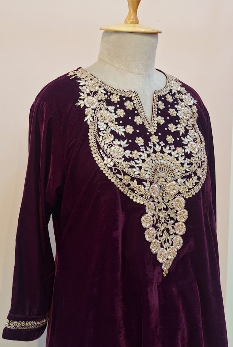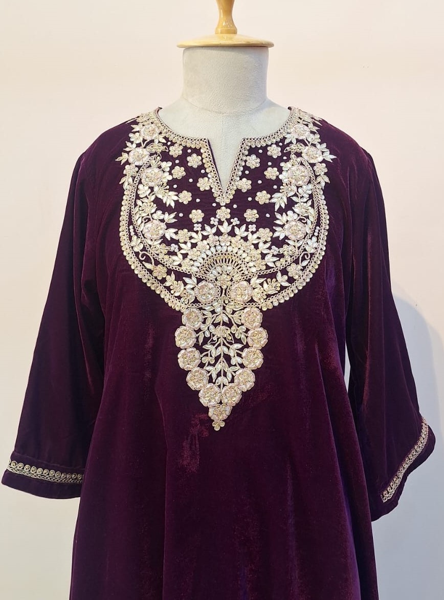 Add a touch of luxury to your ethnic wardrobe with this stunning Wine Velvet Kurti and Pant Set. Crafted from rich velvet fabric, the kurti is beautifully adorned with elegant handwork of Gota patti, Pearl, Sequins, Zardozi and Marodi that enhances its regal appeal. Paired with a perfectly tailored pant, this ensemble offers both comfort and sophistication. Ideal for festive celebrations, evening parties, weddings, and special occasions, the deep wine shade and plush velvet texture make this set a standout choice for elegant dressing.