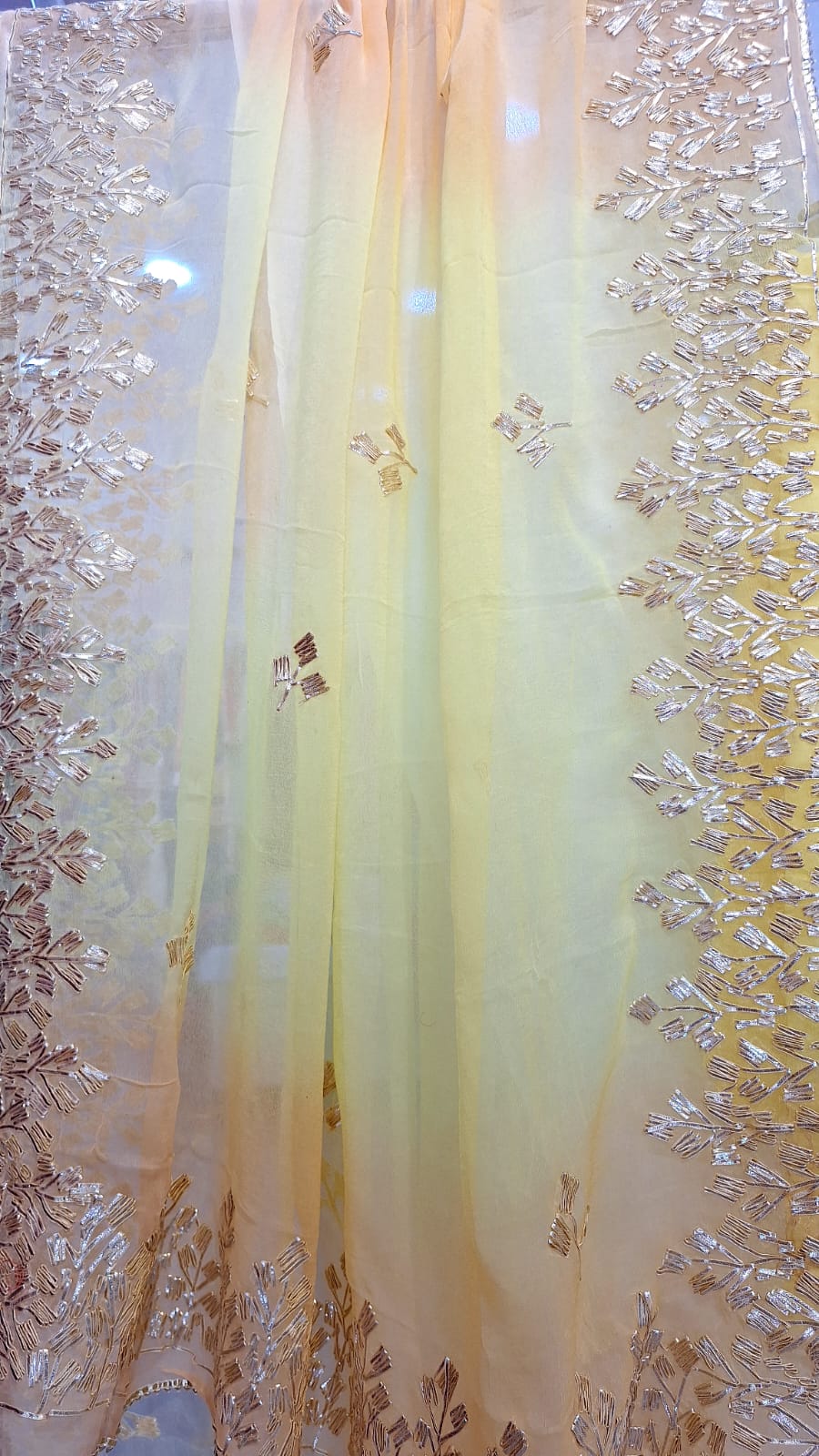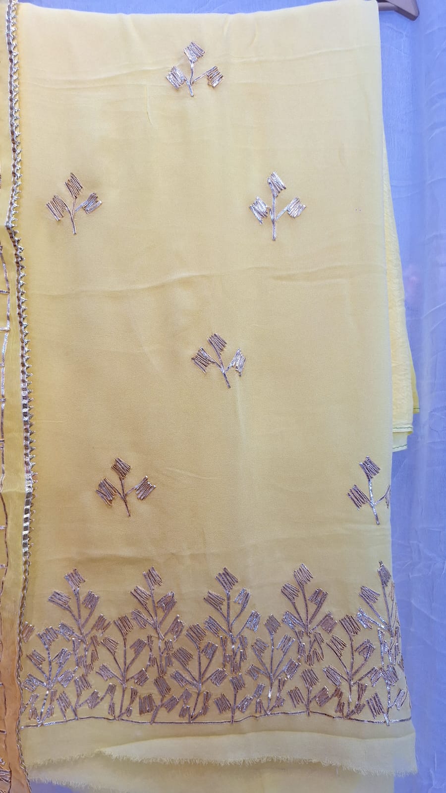 Brighten your festive look with this stunning Yellow Georgette Suit, beautifully embellished with delicate Kacchagota handwork that exudes traditional charm. The set is paired with a Yellow Kesari shaded Shiffon dupatta, intricately detailed with Kacchagota work, adding a graceful contrast. Completed with comfortable Santoon pants, this unstitched suit set perfectly blends elegance, craftsmanship, and vibrant style for festive and celebratory occasions.