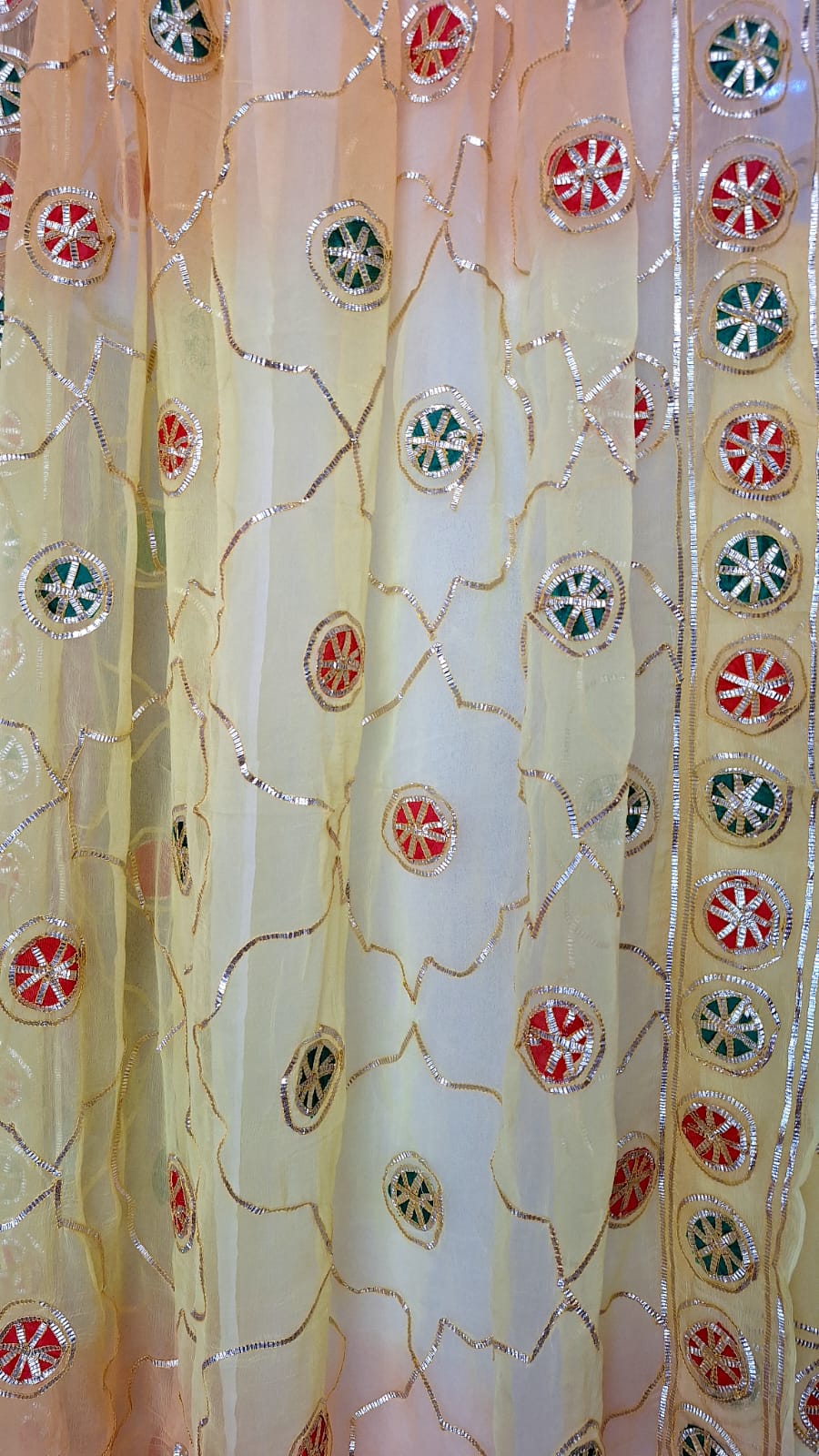 Radiate elegance in this beautiful yellow georgette suit set, paired with a shaded yellow–kesari chiffon dupatta. The suit is adorned with exquisite Kacchagota jaal handwork, adding a touch of traditional artistry and sophistication. It comes with comfortable santoon fabric pants and is available as an unstitched set, allowing for a perfect custom fit.