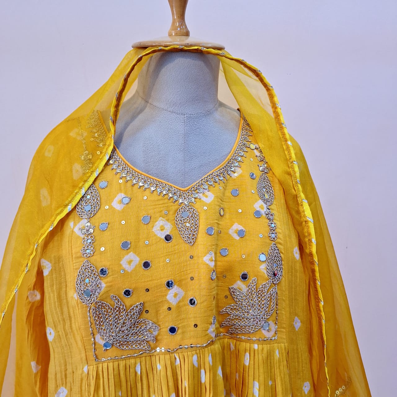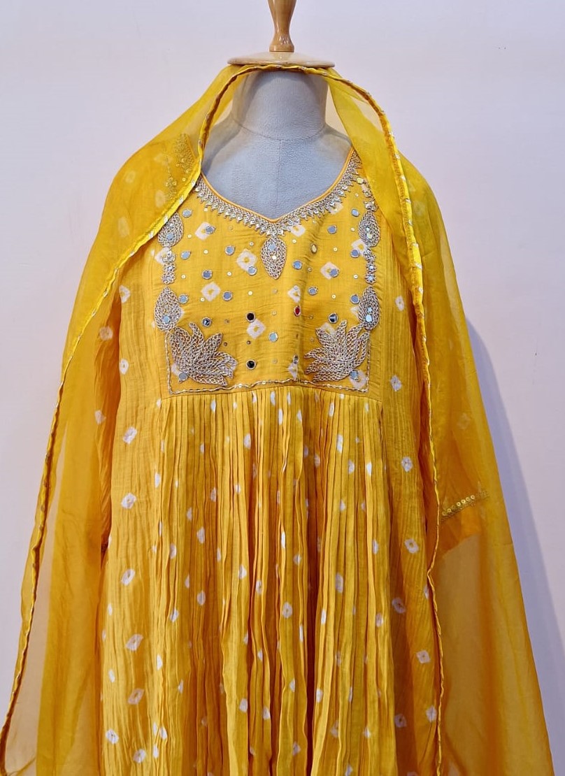 Radiate effortless charm in this elegant light yellow three-piece ensemble, crafted in premium Mul Chanderi fabric with a soft, breathable drape. The kurti is beautifully highlighted with handcrafted mirror and Marodi embroidery work, adding a traditional touch with subtle festive sparkle. Paired with a matching pant and a coordinated dupatta, this set is perfect for bright daytime celebrations.