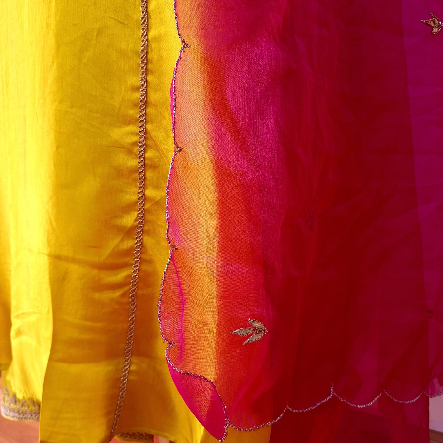 Add a touch of festive charm with this vibrant Yellow Handwork Suit, Pant and Organza Dupatta Set, crafted for elegance and celebration. The suit is beautifully adorned with intricate Marodi and Sequins handwork, giving it a subtle sparkle and artisanal sophistication. The coordinated pants ensure a comfortable and flattering fit, while the sheer organza dupatta in contrasting Rani color adds a luxurious and eye-catching finish to the ensemble. Perfect for weddings, festive gatherings, and special occasions, this set blends traditional craftsmanship with contemporary style, making it a statement outfit for any celebration.