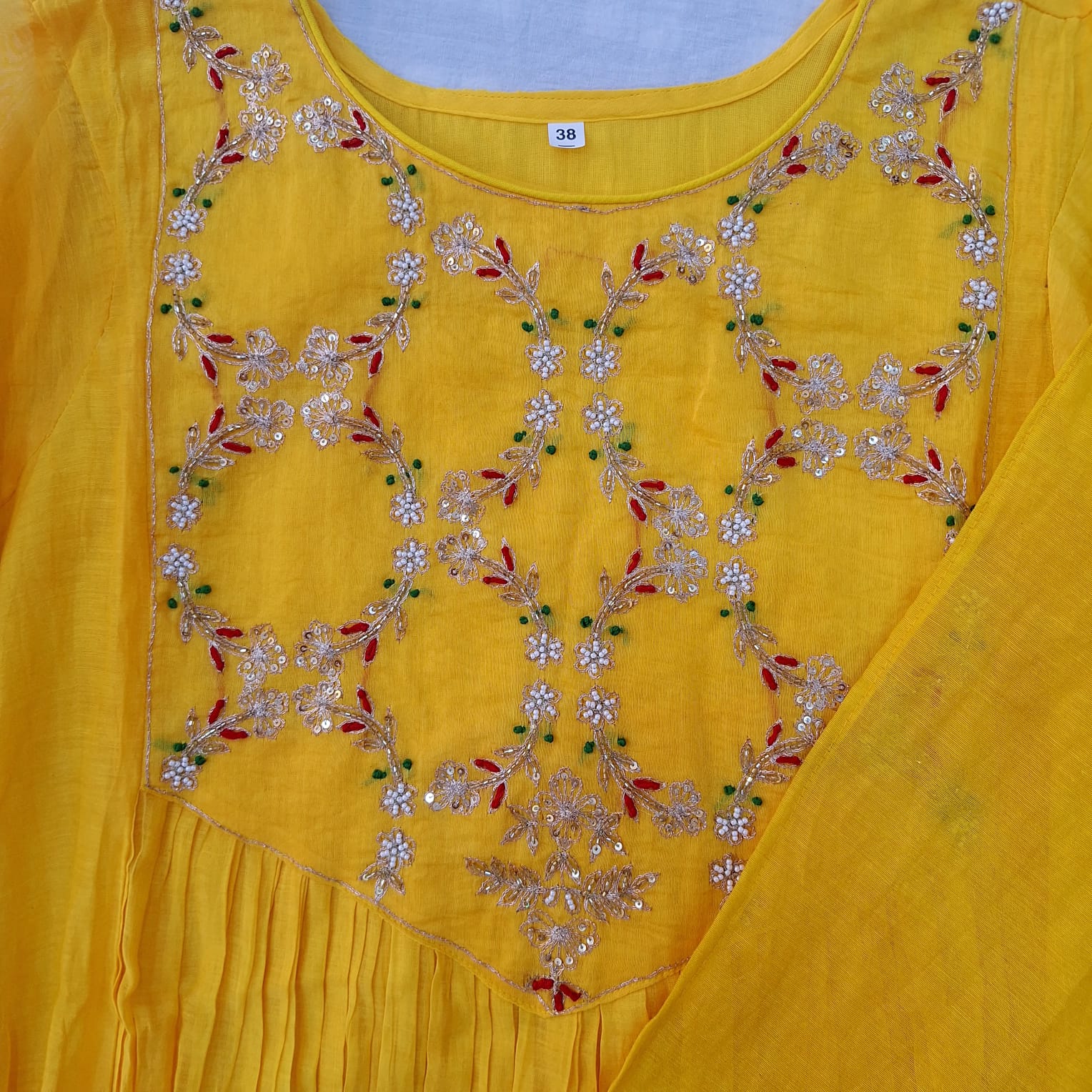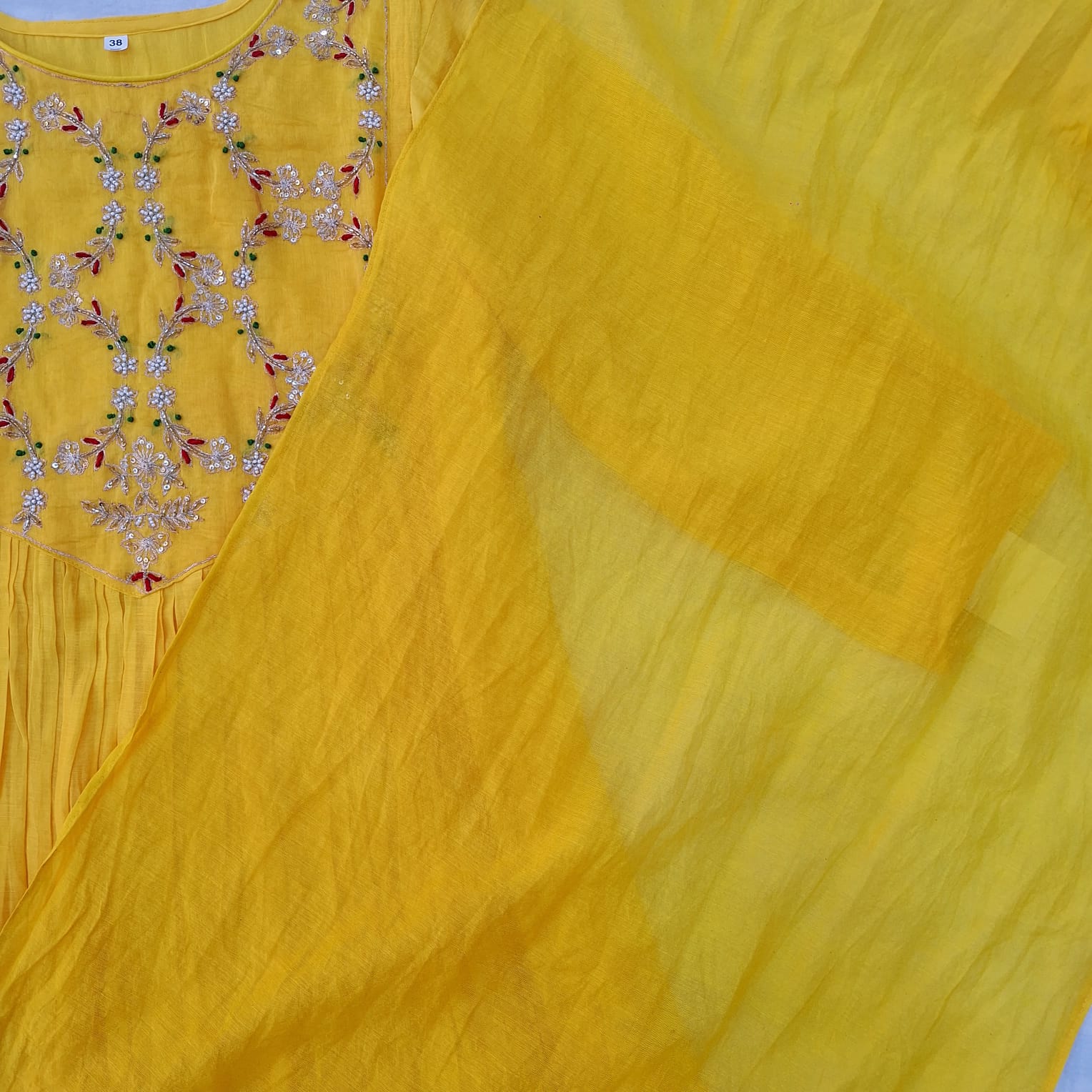 Step into elegance with this Mango Yellow Mul chanderi Suit, pant and dupatta Set, a perfect blend of tradition and grace. The Suit features a beautifully crafted handwork of Sequins, Pearl, Thread and Cutdana adding a touch of refined sparkle and artisanal charm. Made from lightweight and breathable Mul chanderi fabric, the set drapes effortlessly, offering comfort without compromising on style. Paired with matching bottoms and a complementing dupatta, this ensemble is ideal for festive occasions, intimate gatherings, and traditional celebrations where sophistication speaks through subtle detailing.