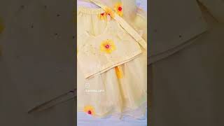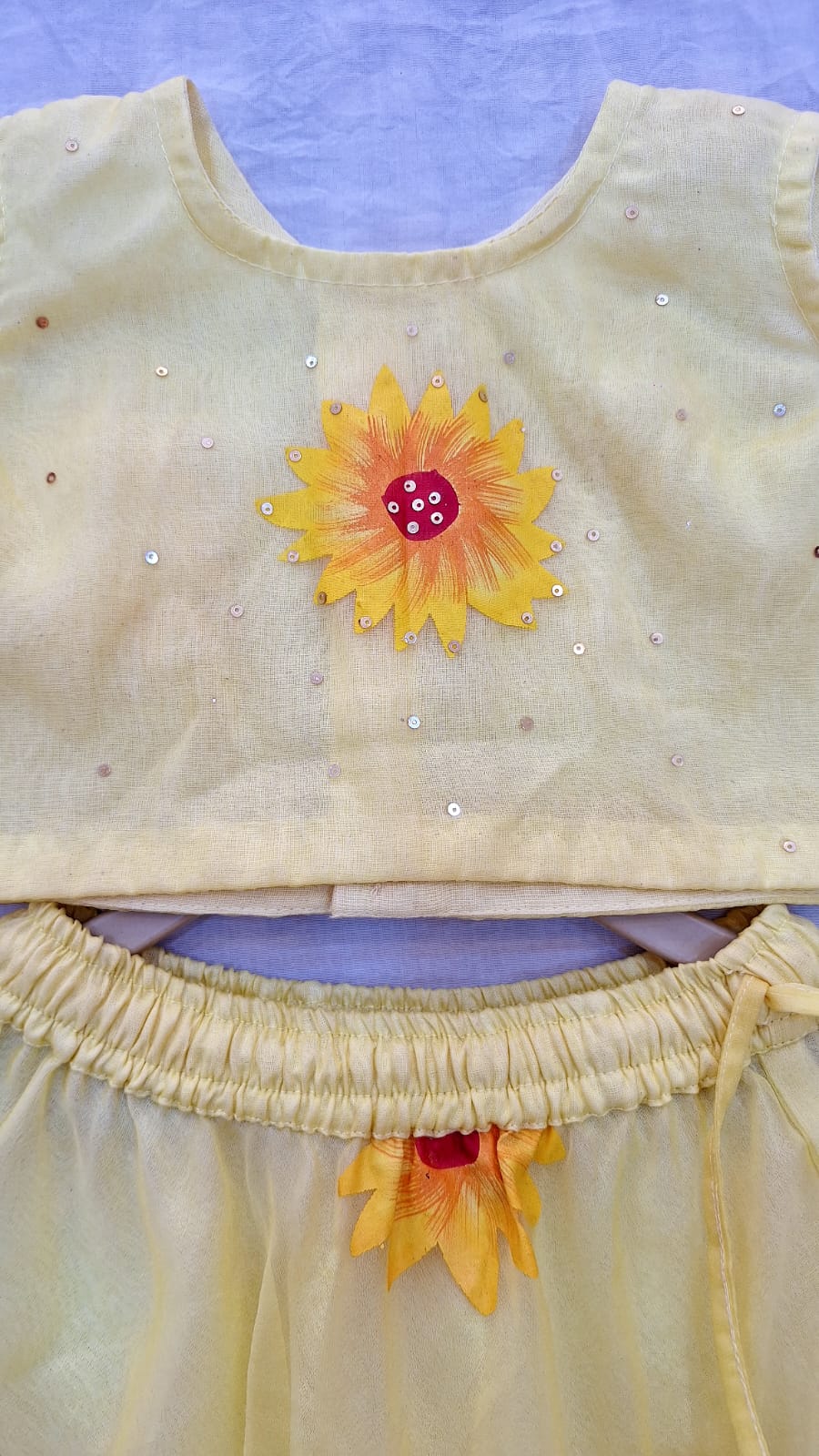 Brighten up special occasions with this delightful yellow organza kids set. Featuring a handpainted top adorned with sequins, paired with a matching skirt and dupatta, this outfit blends artistic charm with festive elegance. Perfect for weddings, parties, and celebrations, it ensures your little one looks stylish and feels comfortable.