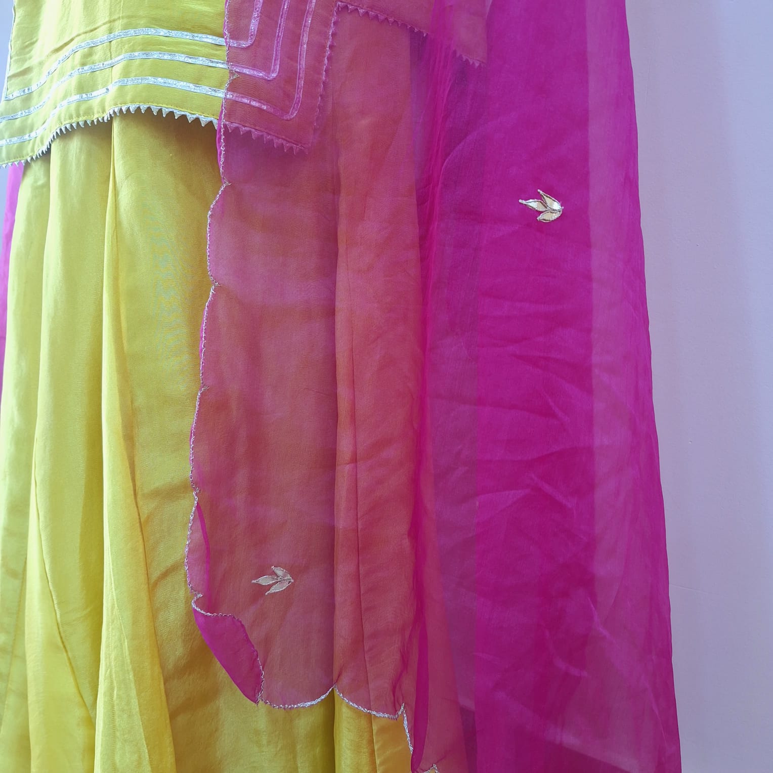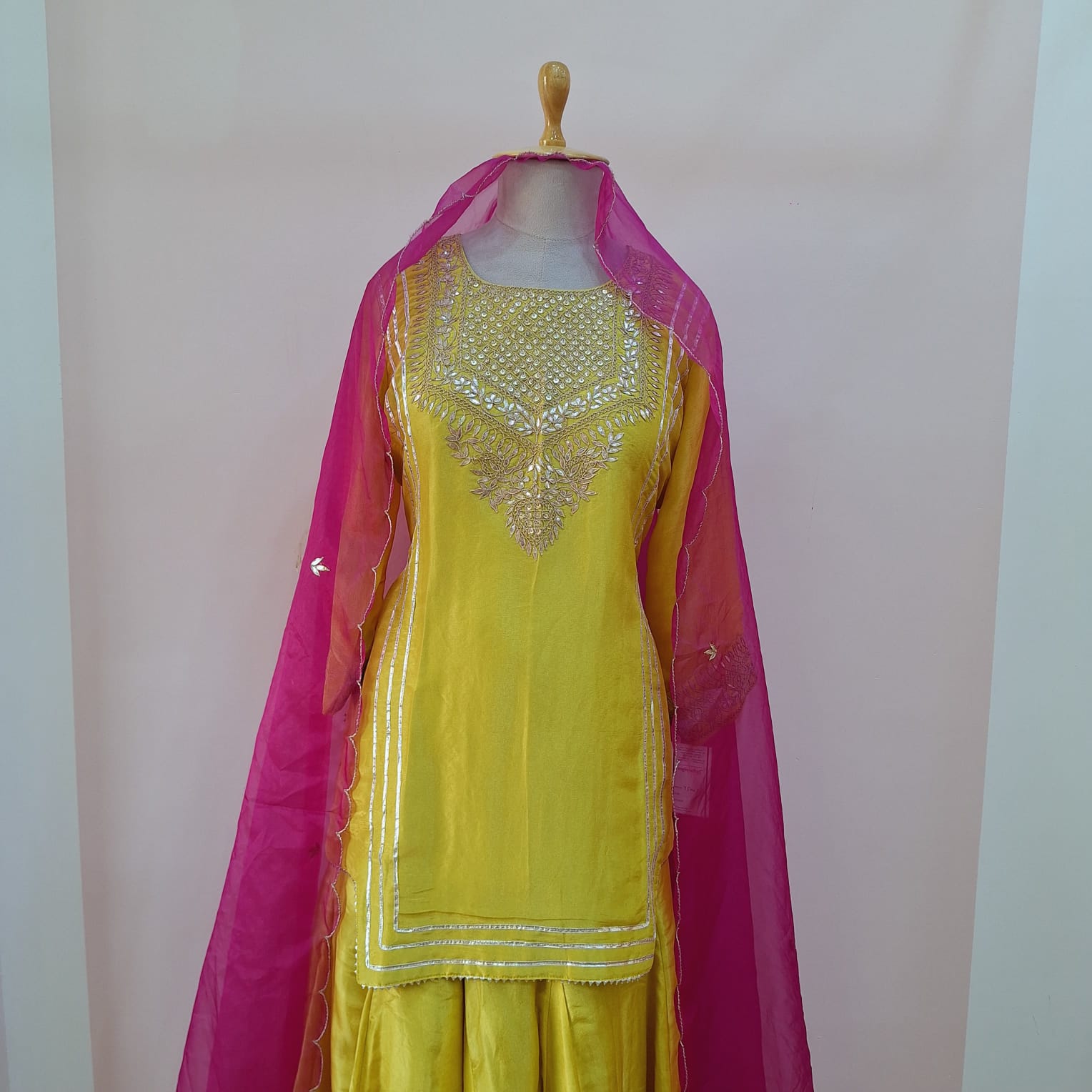 This elegant ensemble features a yellow tissue short kurti adorned with delicate handwork, exuding a soft sheen and refined charm. Paired with a kali-wala flared palazzo that adds graceful movement and a flattering silhouette. The look is completed with a rich rani organza dupatta, beautifully finished with intricate zari cutwork along the borders, lending a regal touch. Perfect for festive gatherings, intimate celebrations, and special occasions.